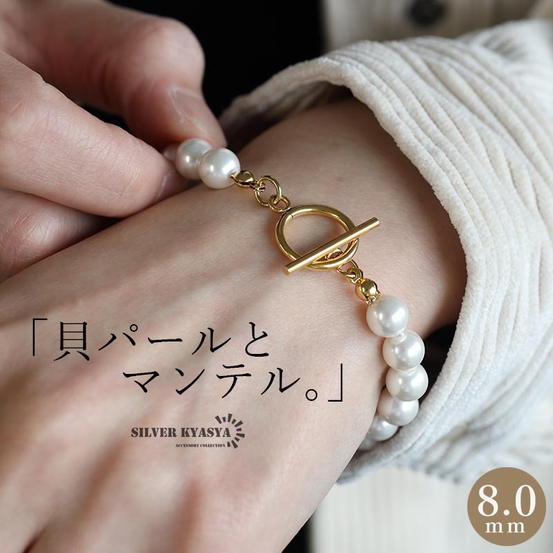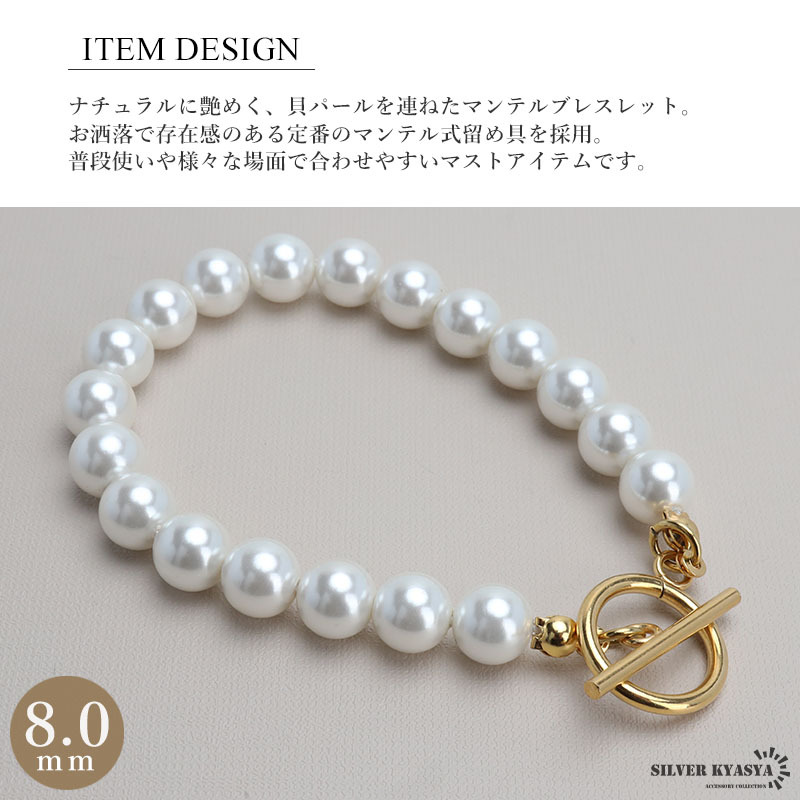 ナチュラルに艶めく、貝パールを連ねたマンテルブレスレット。お洒落で存在感のある定番のマンテル式留め具を採用。普段使いや様々な場面で合わせやすいマストアイテムです。