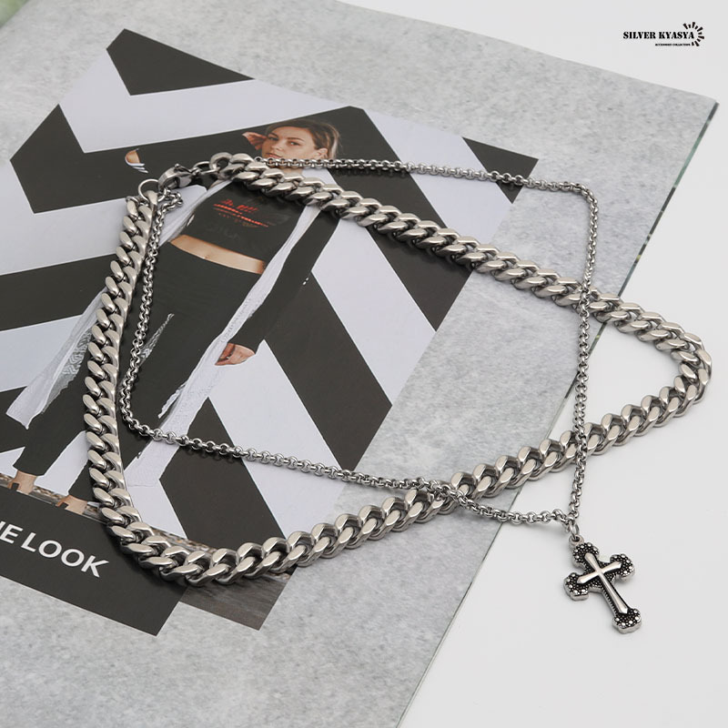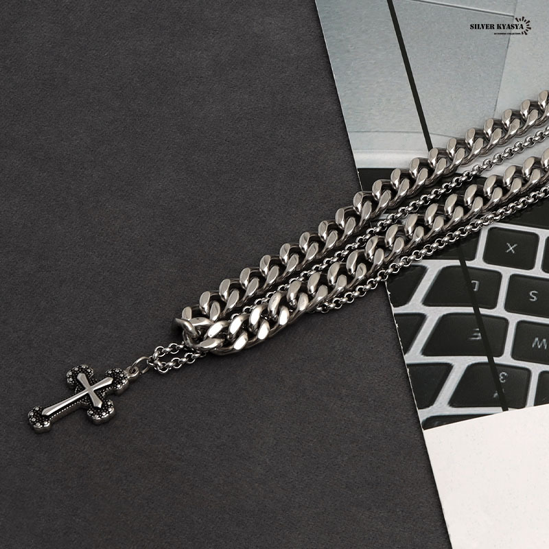 定番人気のクロスネックレスです。クロスの縁には細かな装飾が施されており、喜平チェーンの質感も相まってハードな雰囲気の漂うアイテムになっています。