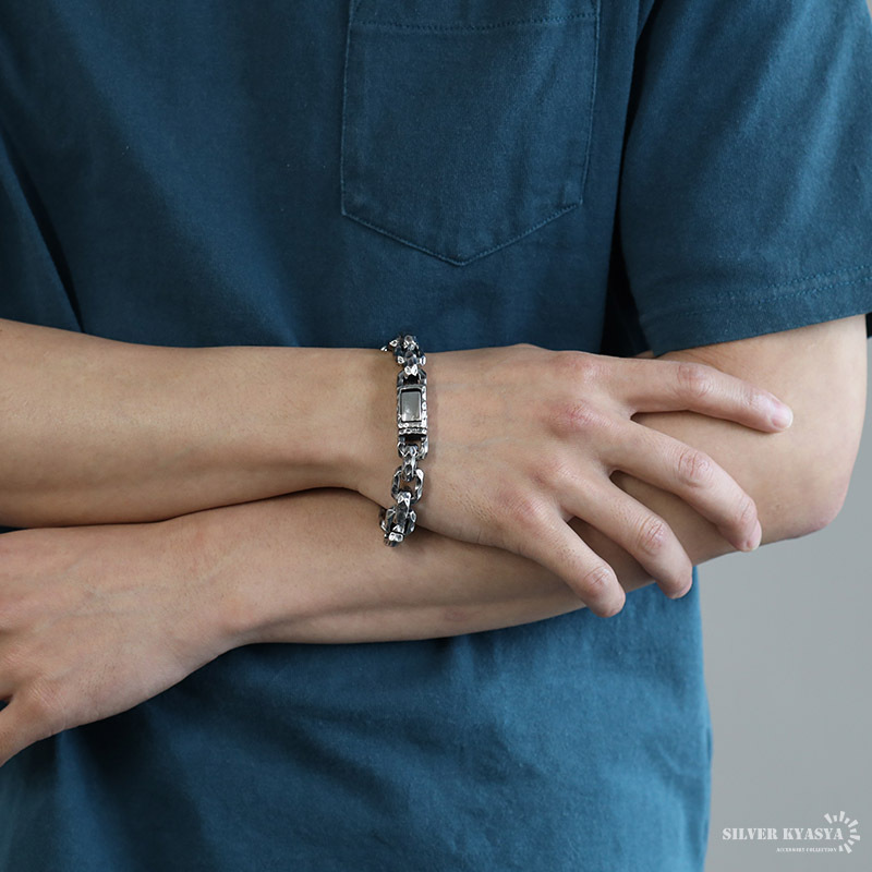 全体に槌目模様を施したアンティークな風合いが魅力のブレスレット。雰囲気たっぷりの燻加工が重厚感を演出します。