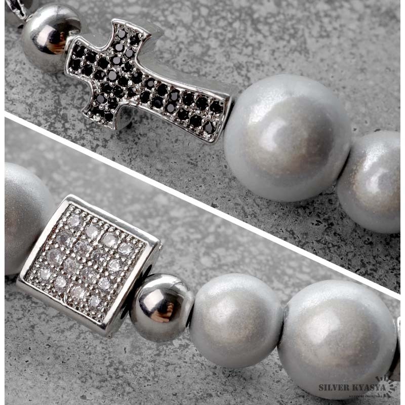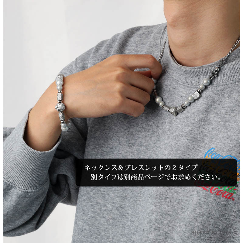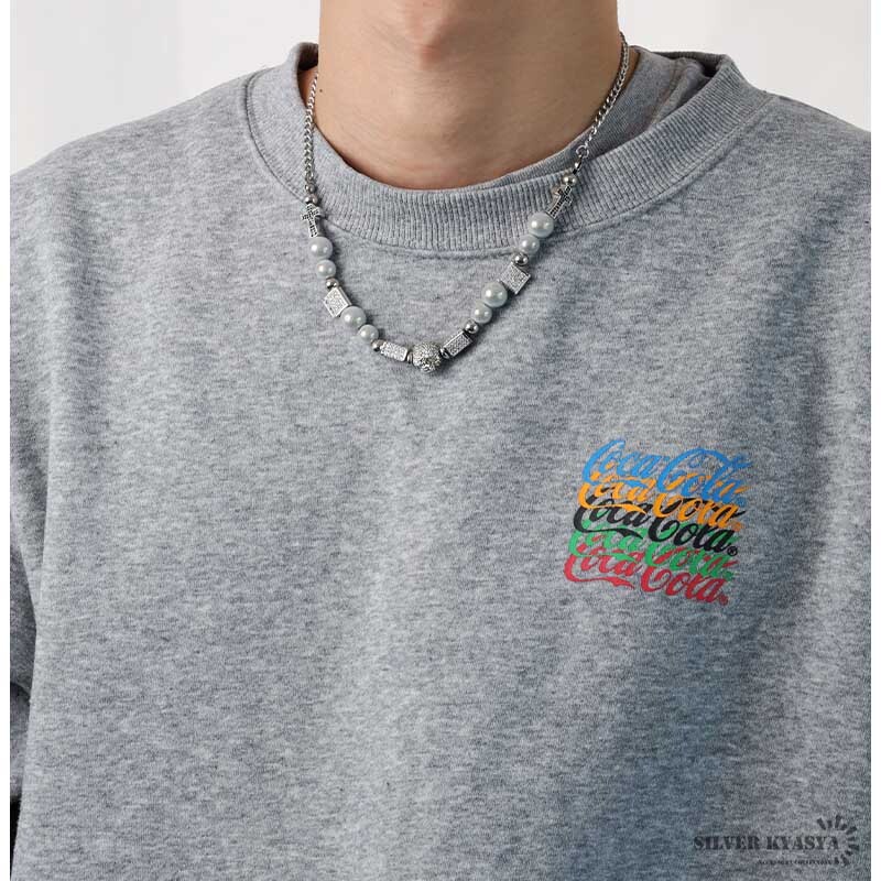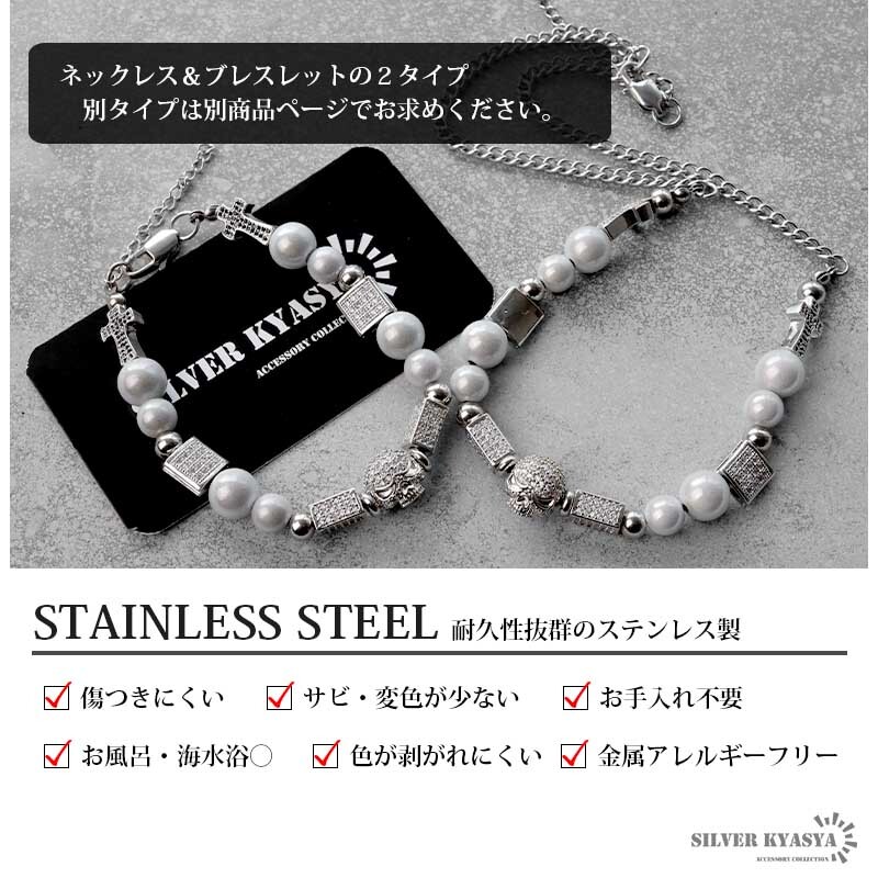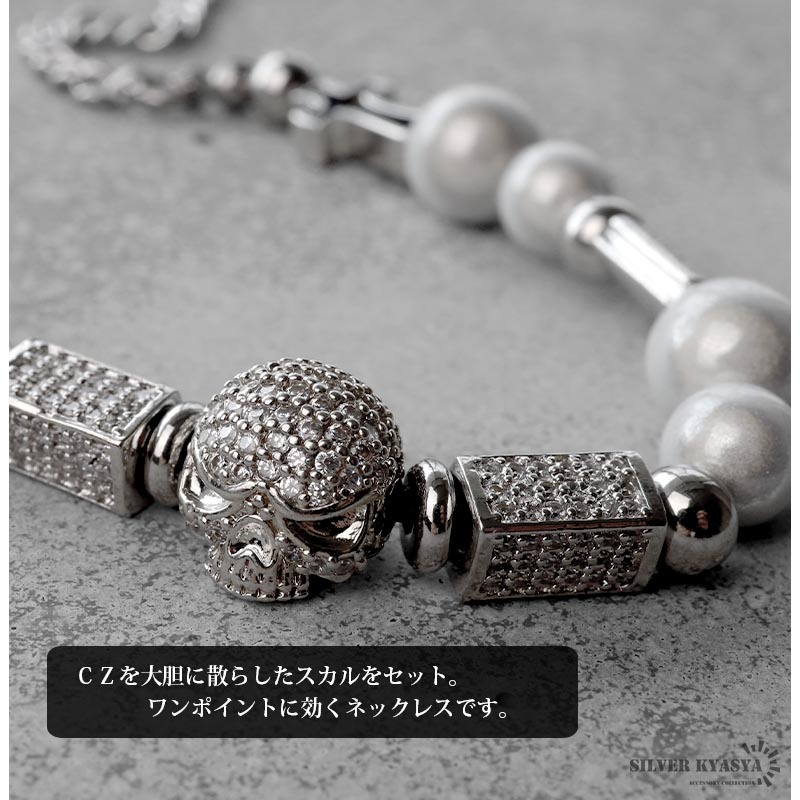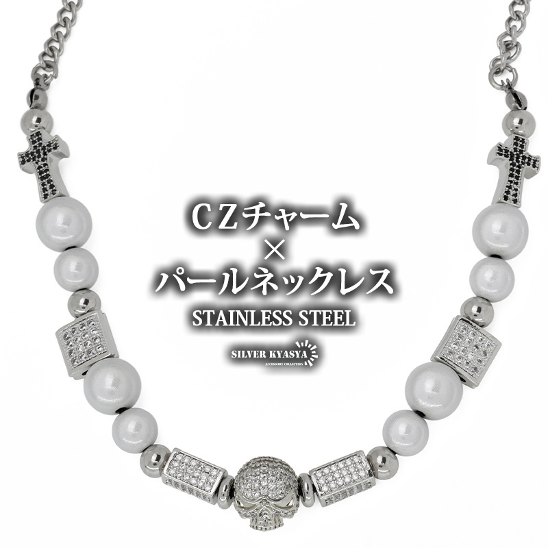 パールネックレス メンズ シルバー ステンレス スカル パール チェーンネックレス 十字架 クロス CZ 金属アレルギー