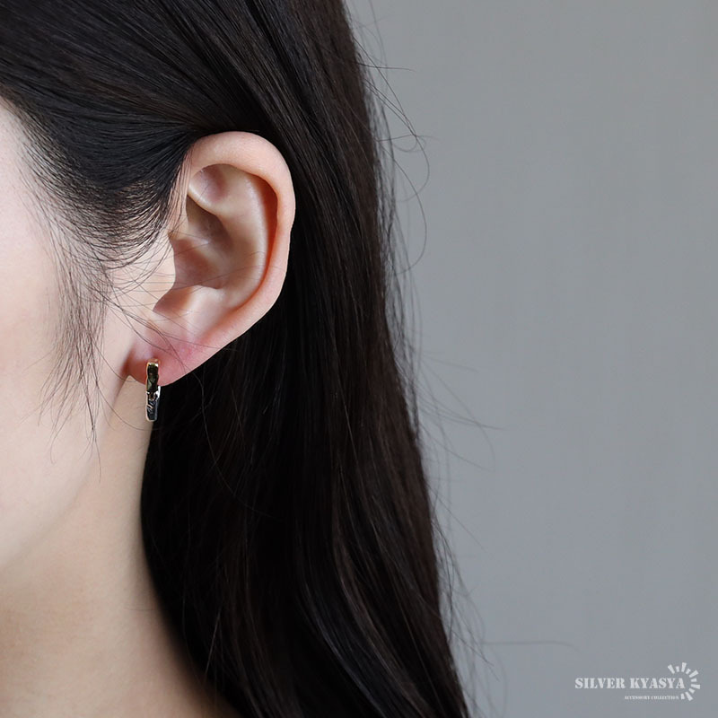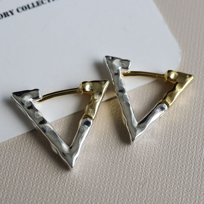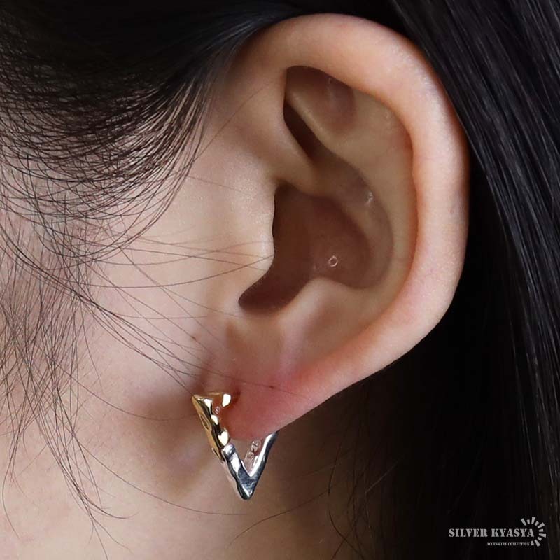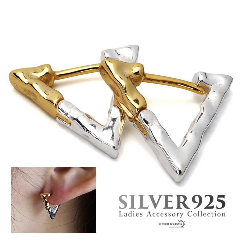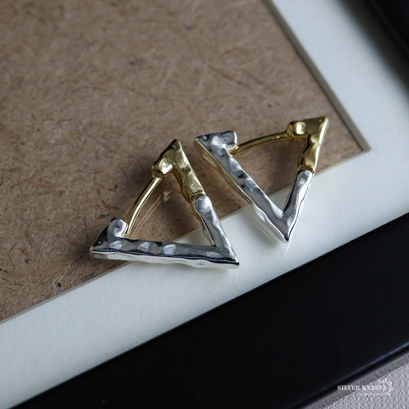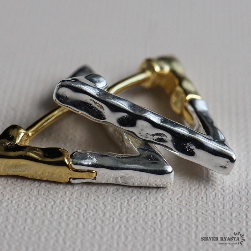 シルバー925 トライアングルピアス silver gold バイカラーフープピアス 三角 槌目 両耳用 金属アレルギーフリー