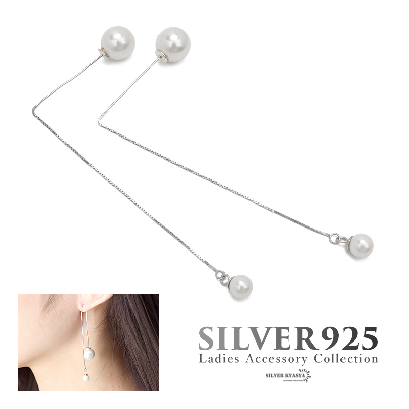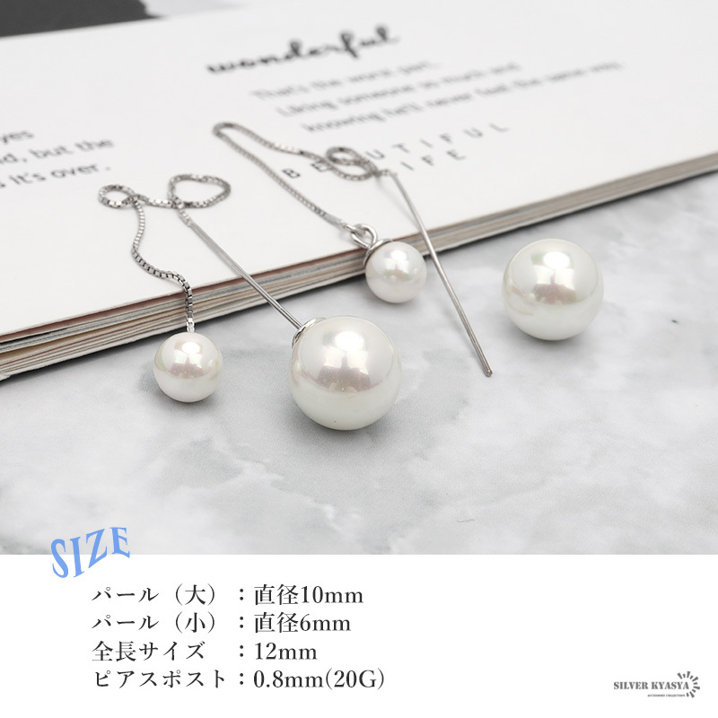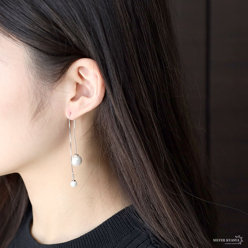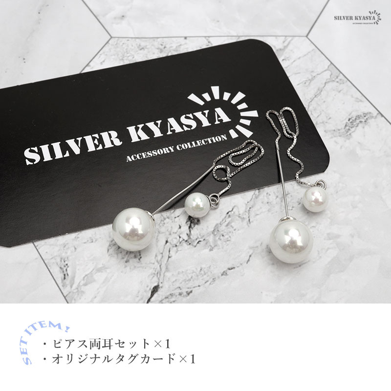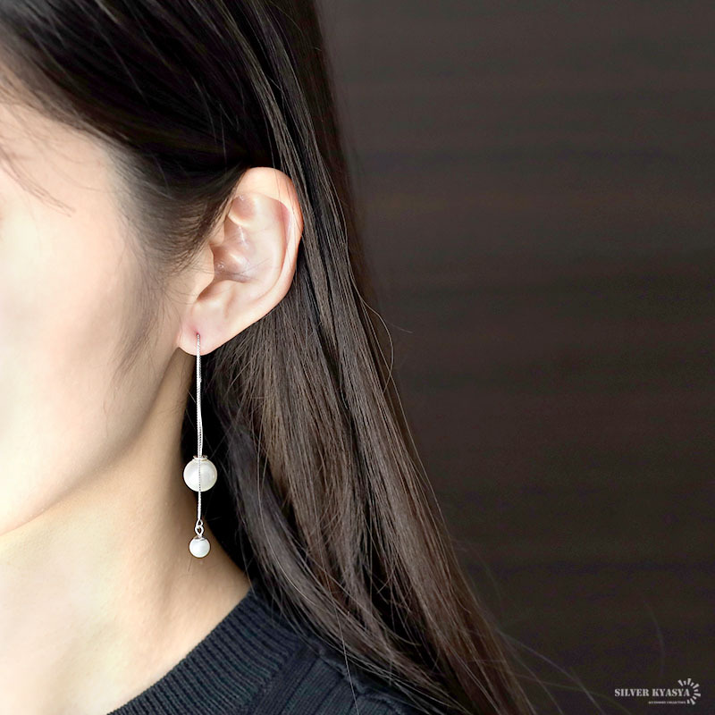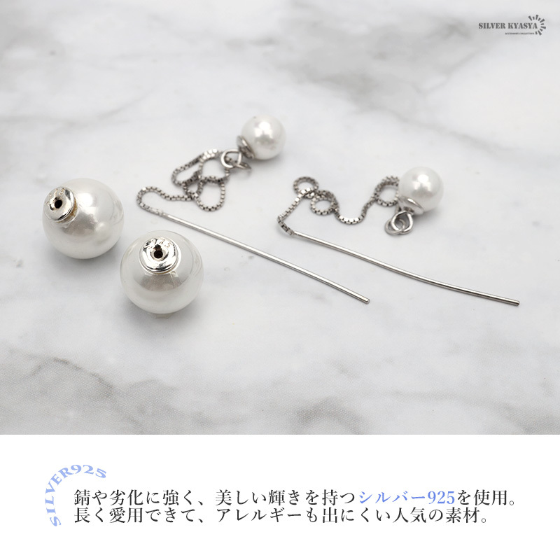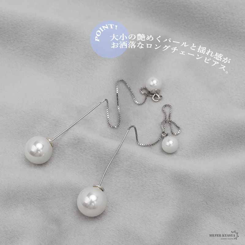 ピアス 金属アレルギー レディース シルバー925 パール 貝パール チェーン スティック シルバー 銀 両耳用 2点