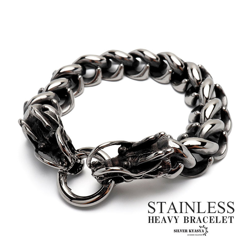サージカルステンレス316L ドラゴンと茨ブレスレット シルバー 燻し風加工 チェーンブレスレット 金属アレルギー対応