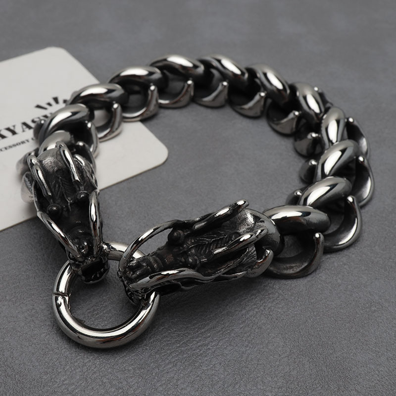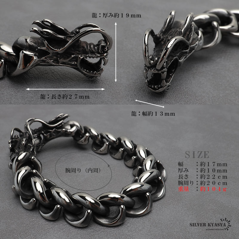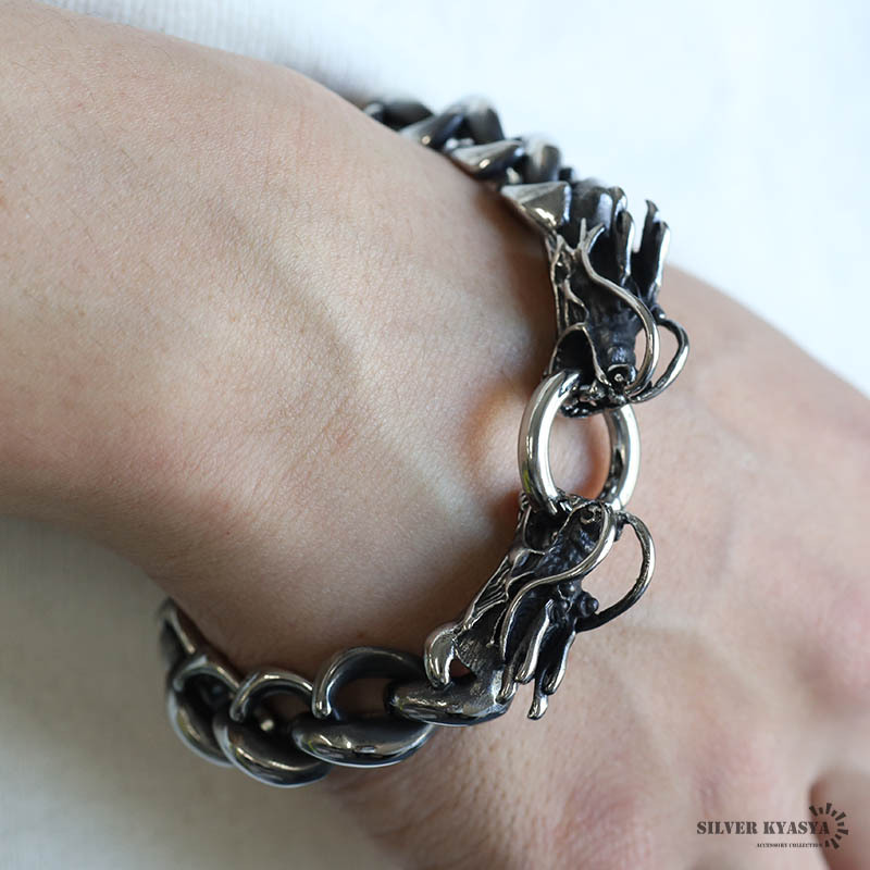 重厚感のある茨チェーンとリアルな龍の顔を組み合わせたブレスレット。迫力ある雰囲気を漂わせる燻し風加工など拘ったデザインが魅力。龍が腕にズシリと絡みつき、目を惹くアイテムです。