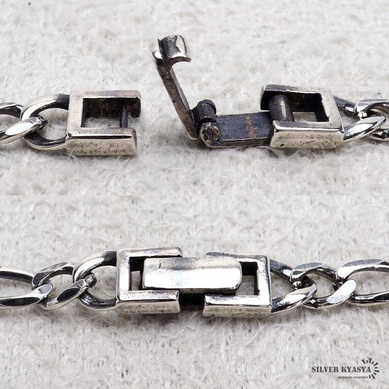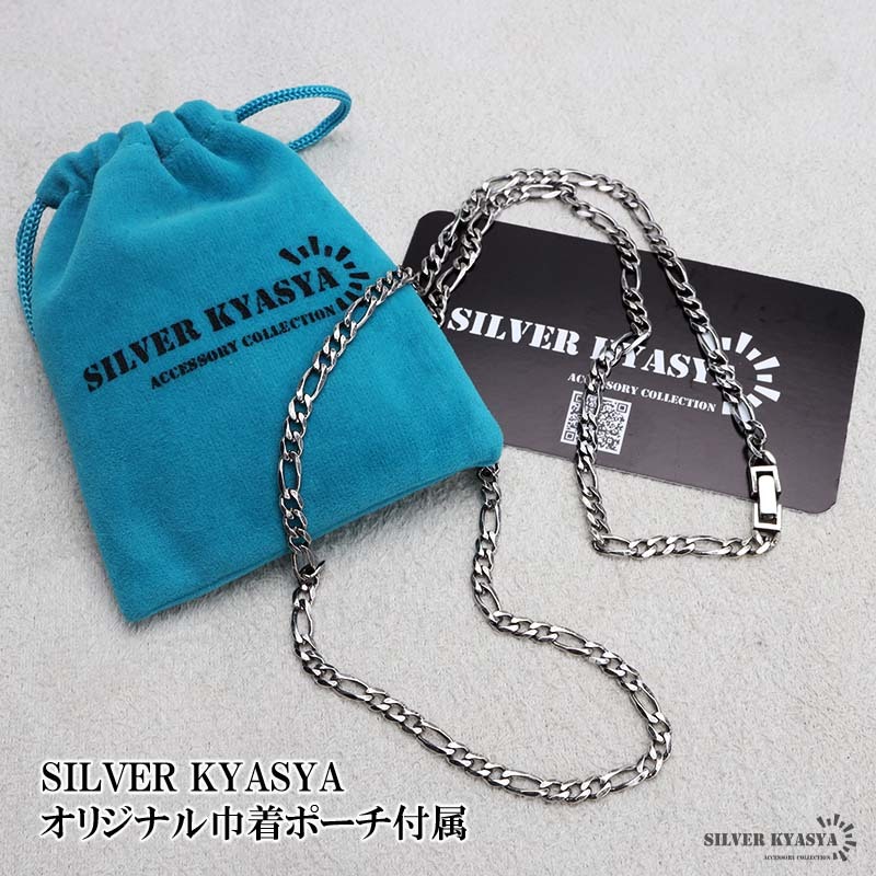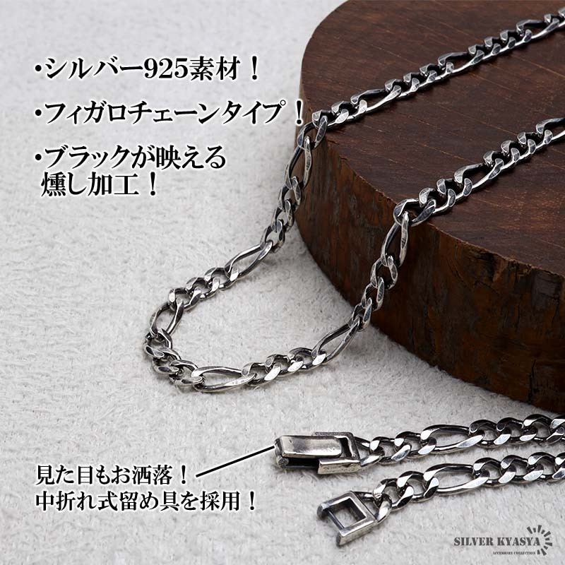 長いコマと短いコマを組み合わせて連ねたお洒落なデザインが魅力のフィガロチェーンネックレス。細身ながらもユニークな6面カットと燻し加工により存在感をプラス。SILVER KYASYA独自のオリジナルデザインアイテムで、ここにしかないデザインを楽しめます。