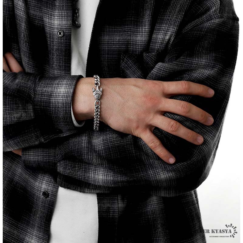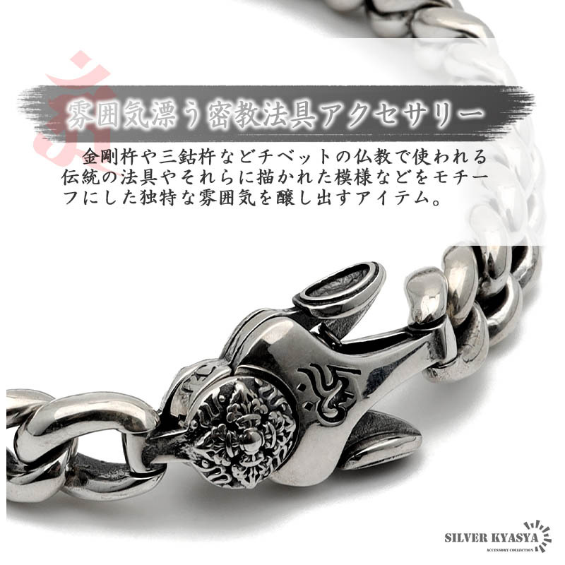■金剛杵・梵字・六字真言を刻印した留め具が特徴的な喜平タイプのブレスレット。着脱のかんたんな大判サイズの留め具を採用。