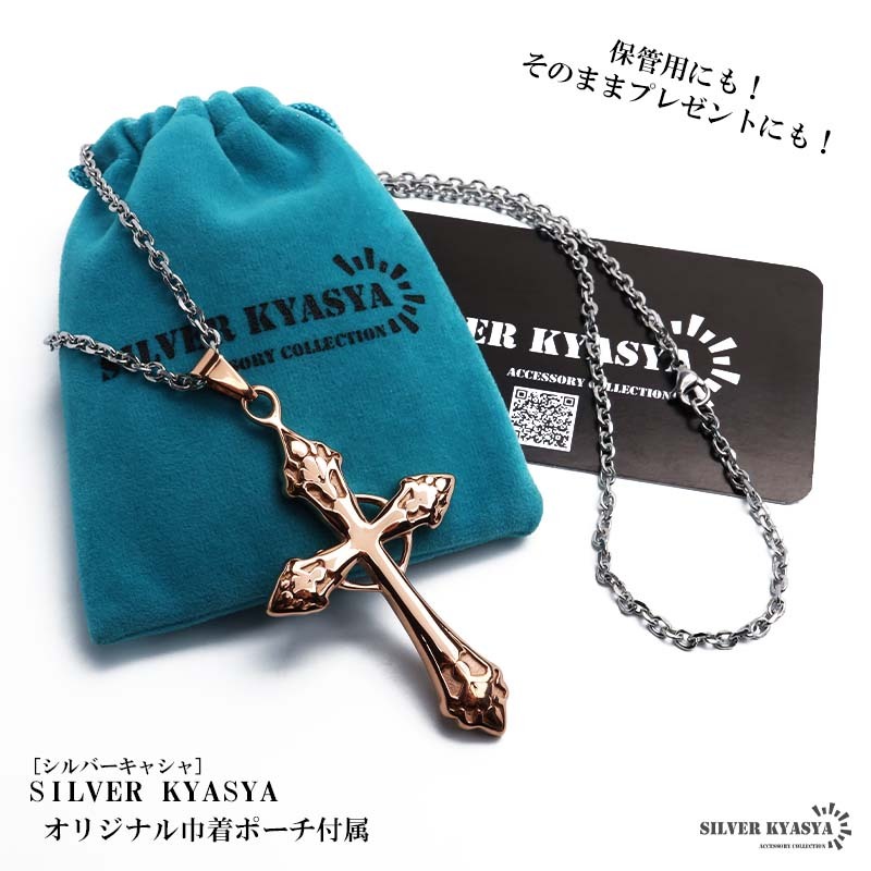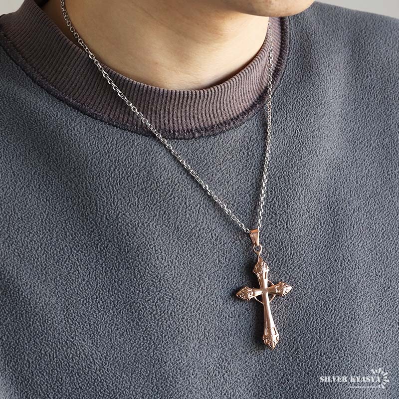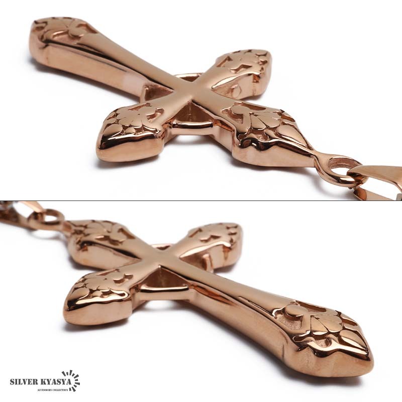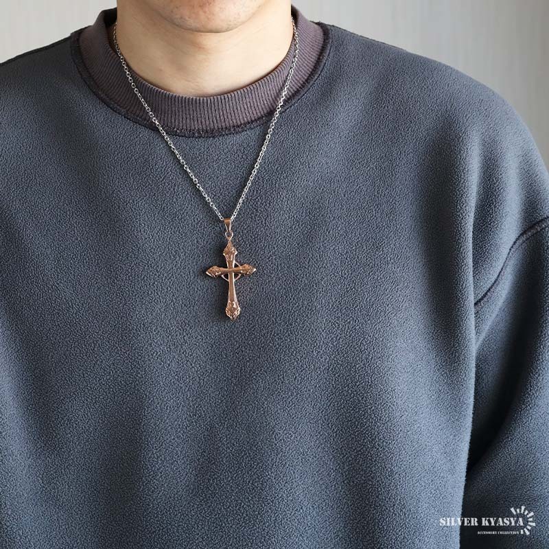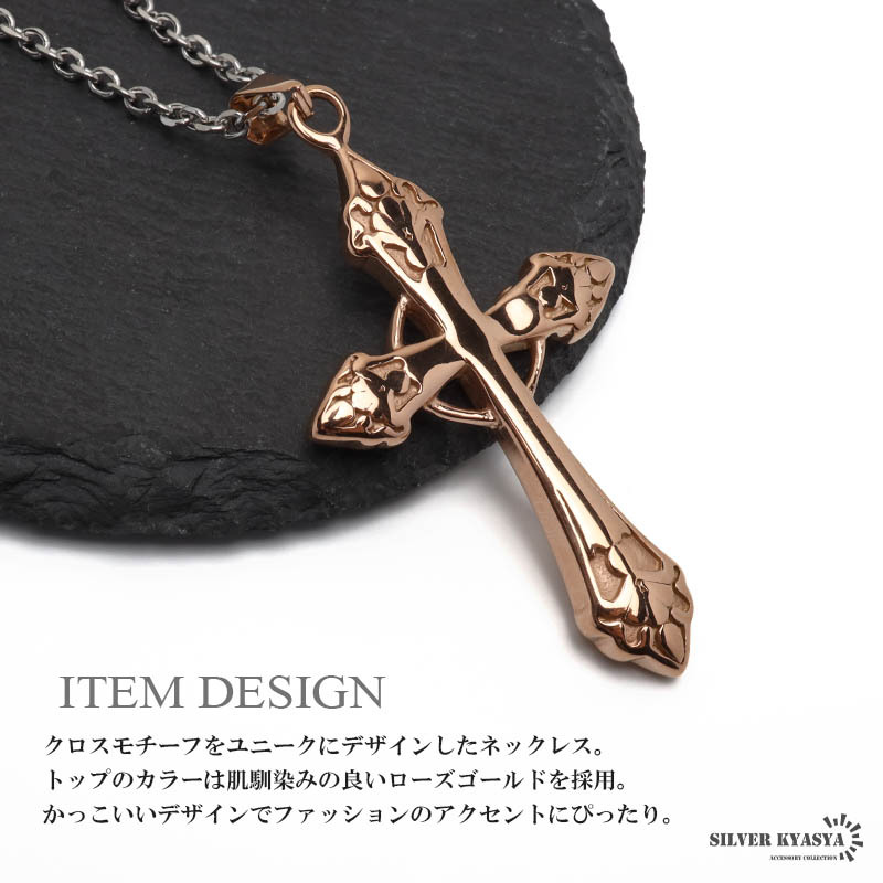 クロスモチーフをユニークにデザインしたネックレス。トップのカラーは肌馴染みの良いローズゴールドを採用。かっこいいデザインでファッションのアクセントにぴったり。