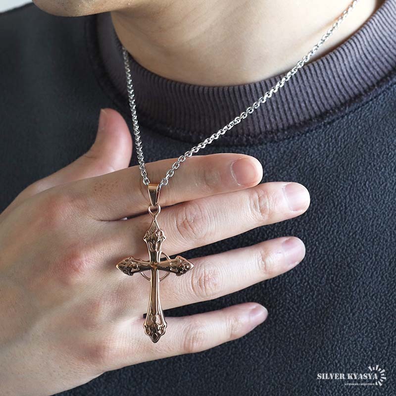 ステンレス クロスネックレス メンズネックレス ピンク あずきチェーン 十字架 メタル 男性 金アレ対応