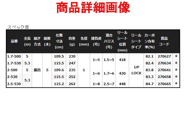 1.7-500 Flexible POWER 40~50㎝までの尾長グレを想定したモデル。 ノされ角度になる際に、バット付近までフレキシブルにロッドが追従。緩やかにいなし、確実に体力を消耗させ、しっかりと浮かせることが可能な調子。細ハリスを想定する際や、尾長グレとのファイトに対して不利な釣り座など不安要素が多いシーンで活躍。太径設計の弱点である風等、ロッドが受ける抵抗を軽減。正確なロッドワークをサポート。 |