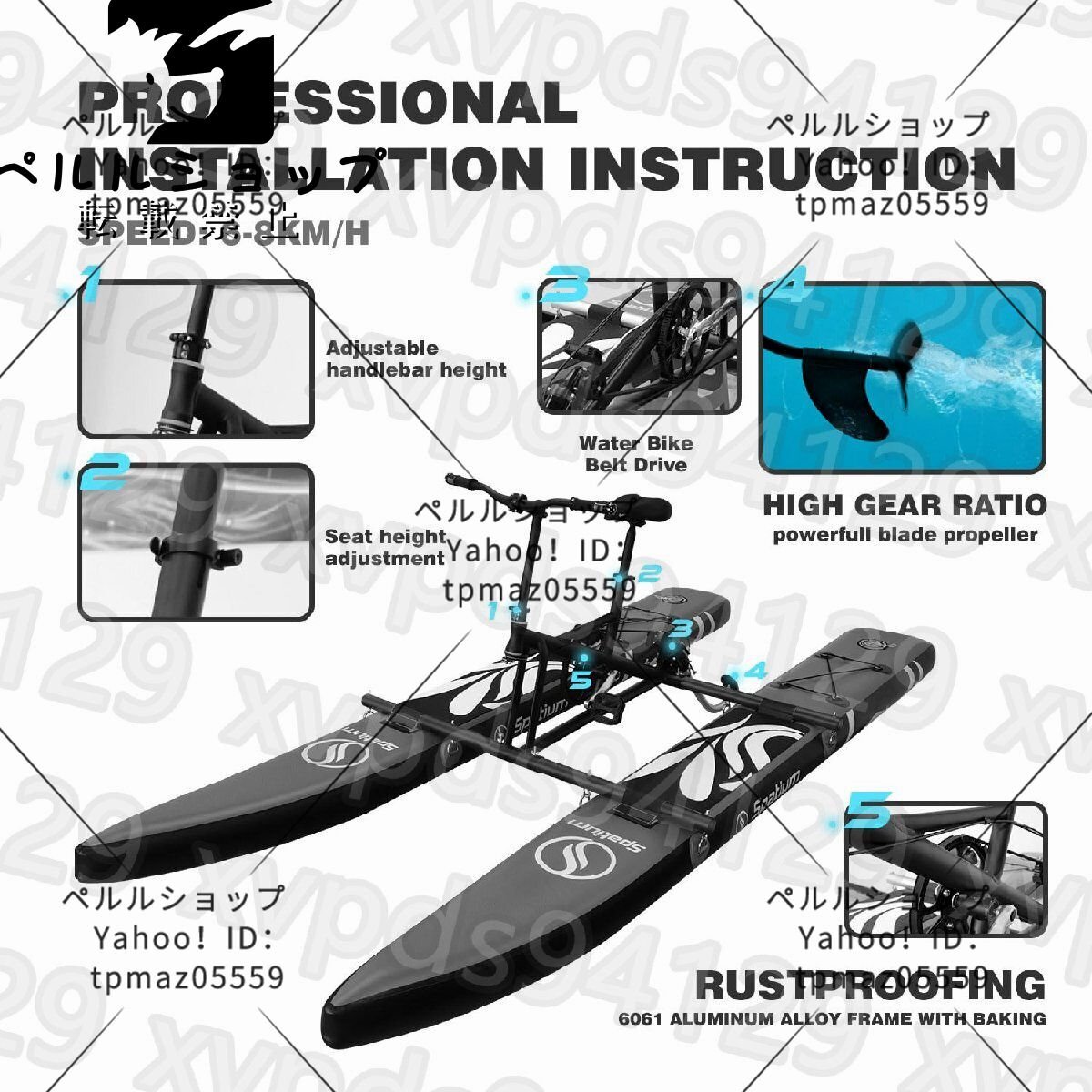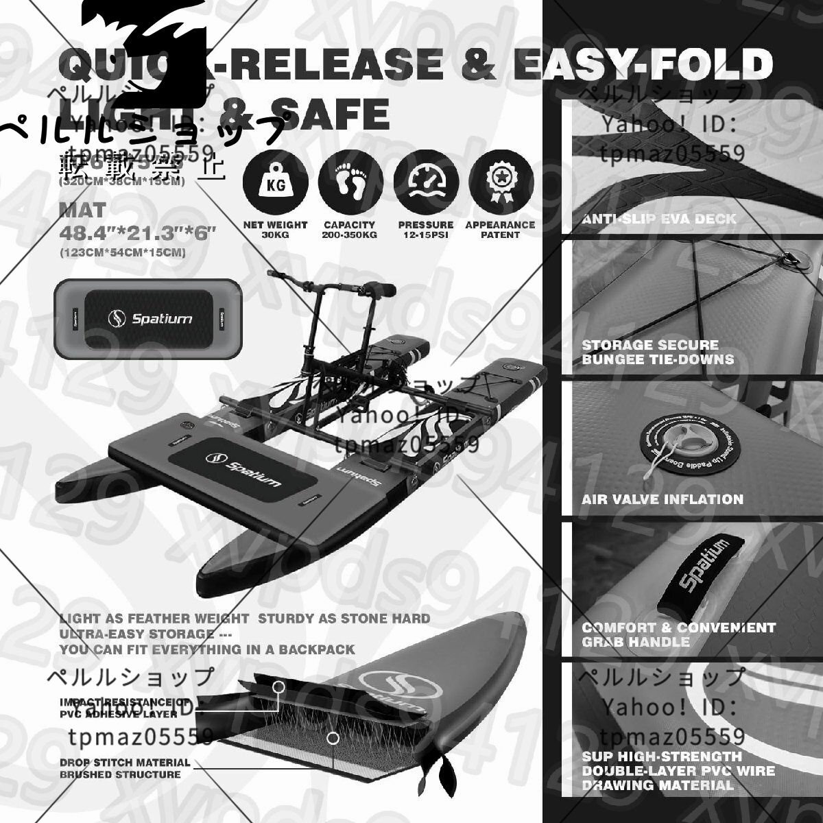 ?【ウォータースポーツの新機能】Spatiumインフレータブルペダルカヤックは、2つのSUPポンツーンに取り付けられたプロペラ自転車で構成され、プロペラの方向は自転車のハンドルバーで制御し、ペダルの方向は前後に変更できます。巡航速度は時速6~8km、水の中を移動するときに両手が自由になり、やりたいことを何でも行えます。
