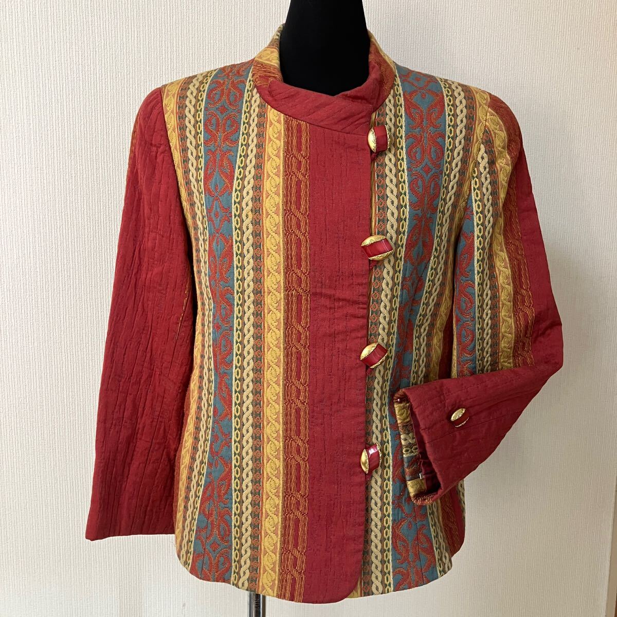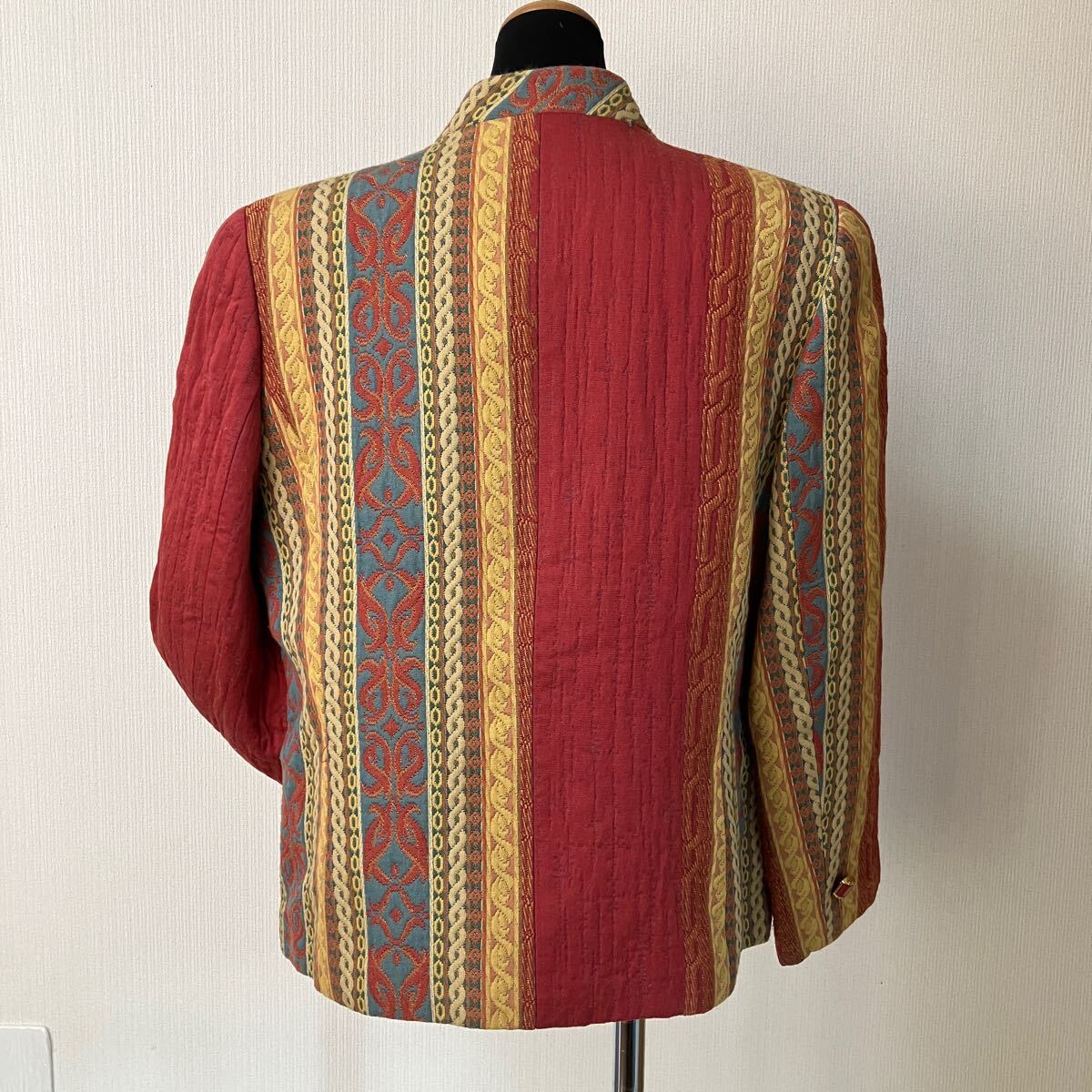 赤と多色のストライプが特徴のスタンドカラージャケット。