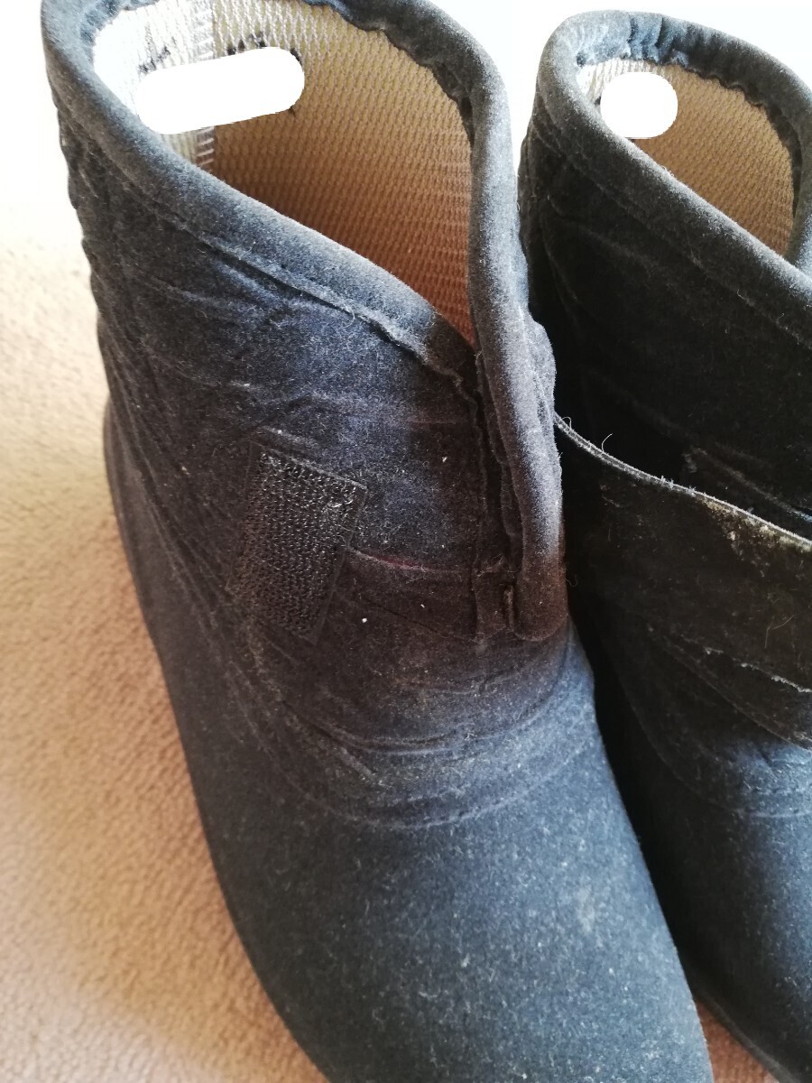 スエード素材の黒いショートブーツ、マジックテープで簡単に履ける!