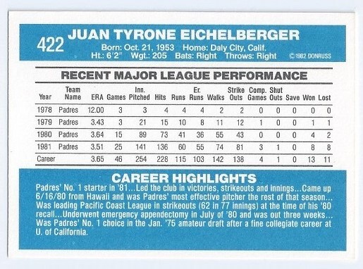 1982 (PADRES) Donruss #422A Juan Eichelberger/ERR (Photo actually/Gary Lucas