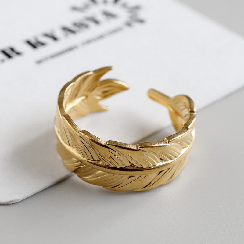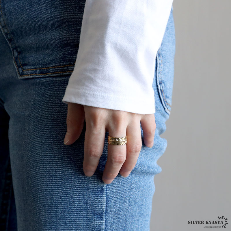 フェザーをモチーフにしたゴールドリング。毛並みの一本一本まで再現したこだわりのデザインが魅力です。ワイドシルエットでアクセントに最適のアイテム。