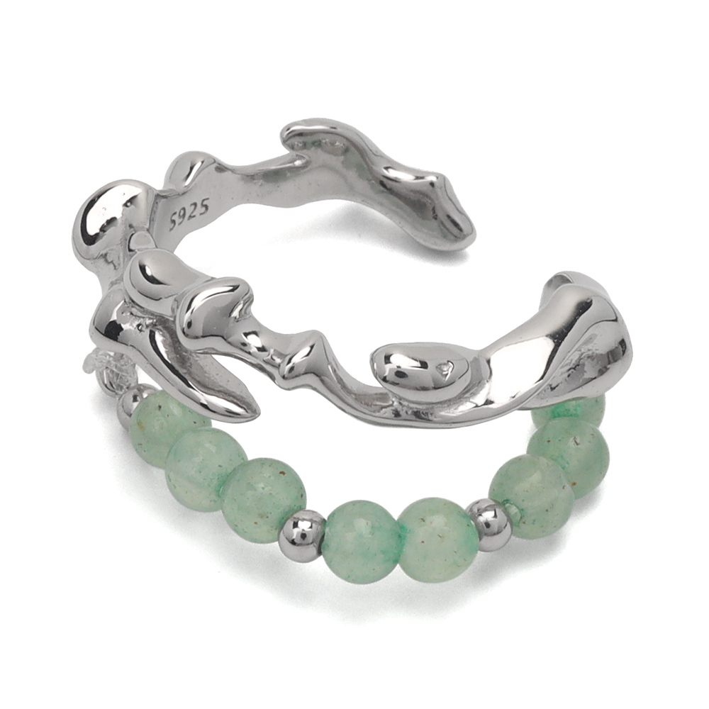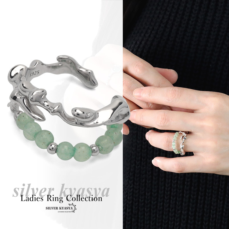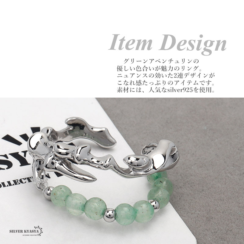 グリーンアベンチュリンの優しい色合いが魅力のリング。ニュアンスの効いた2連デザインがこなれ感たっぷりのアイテムです。