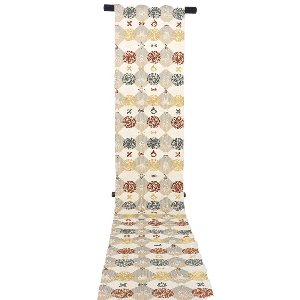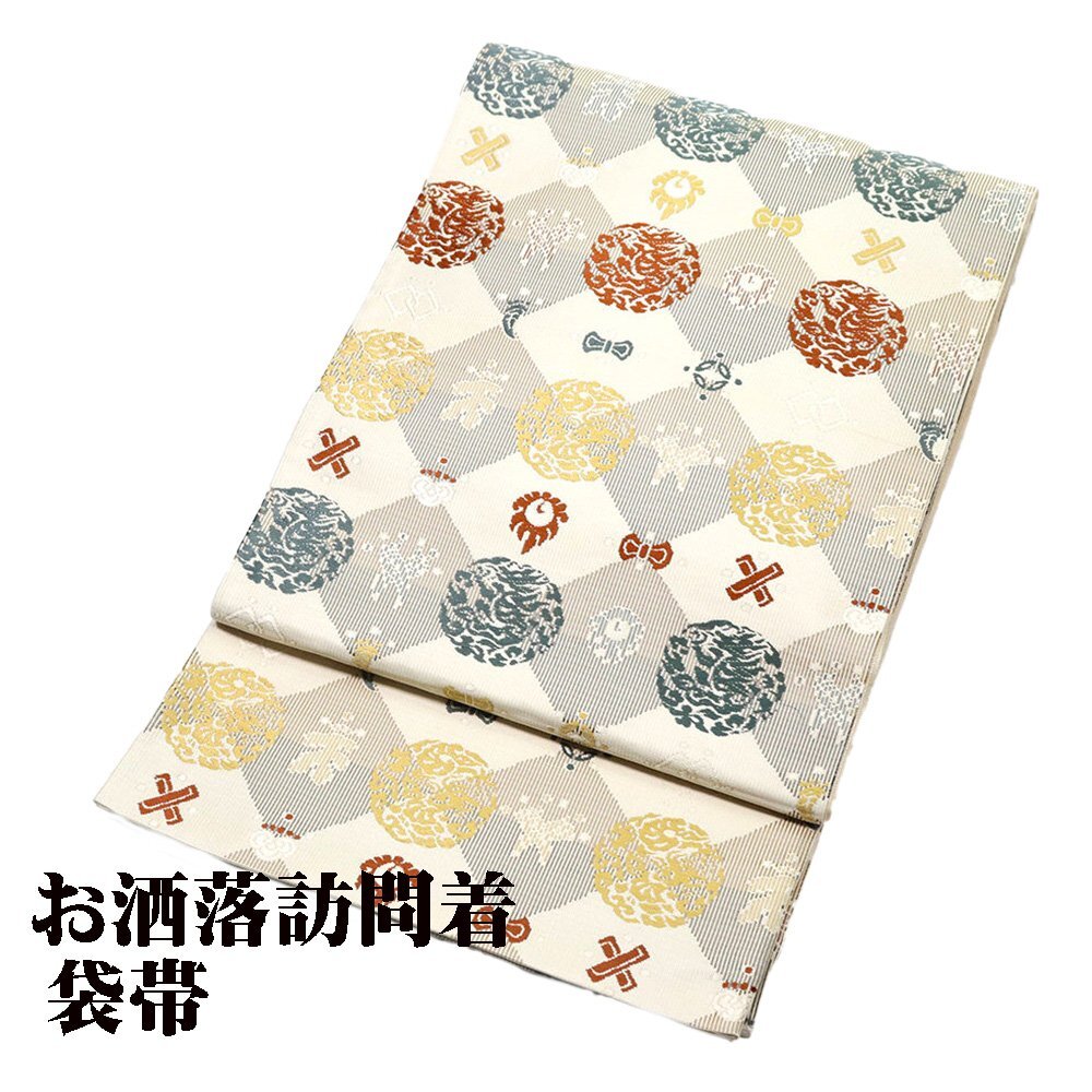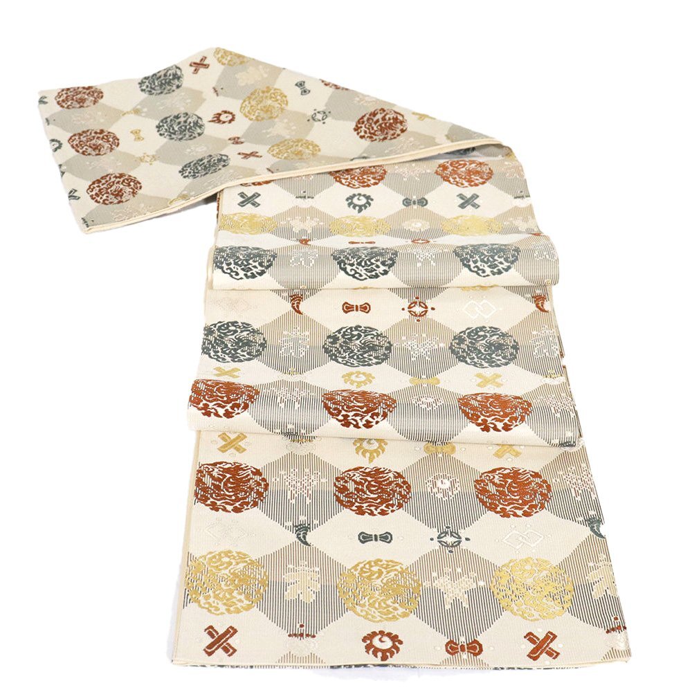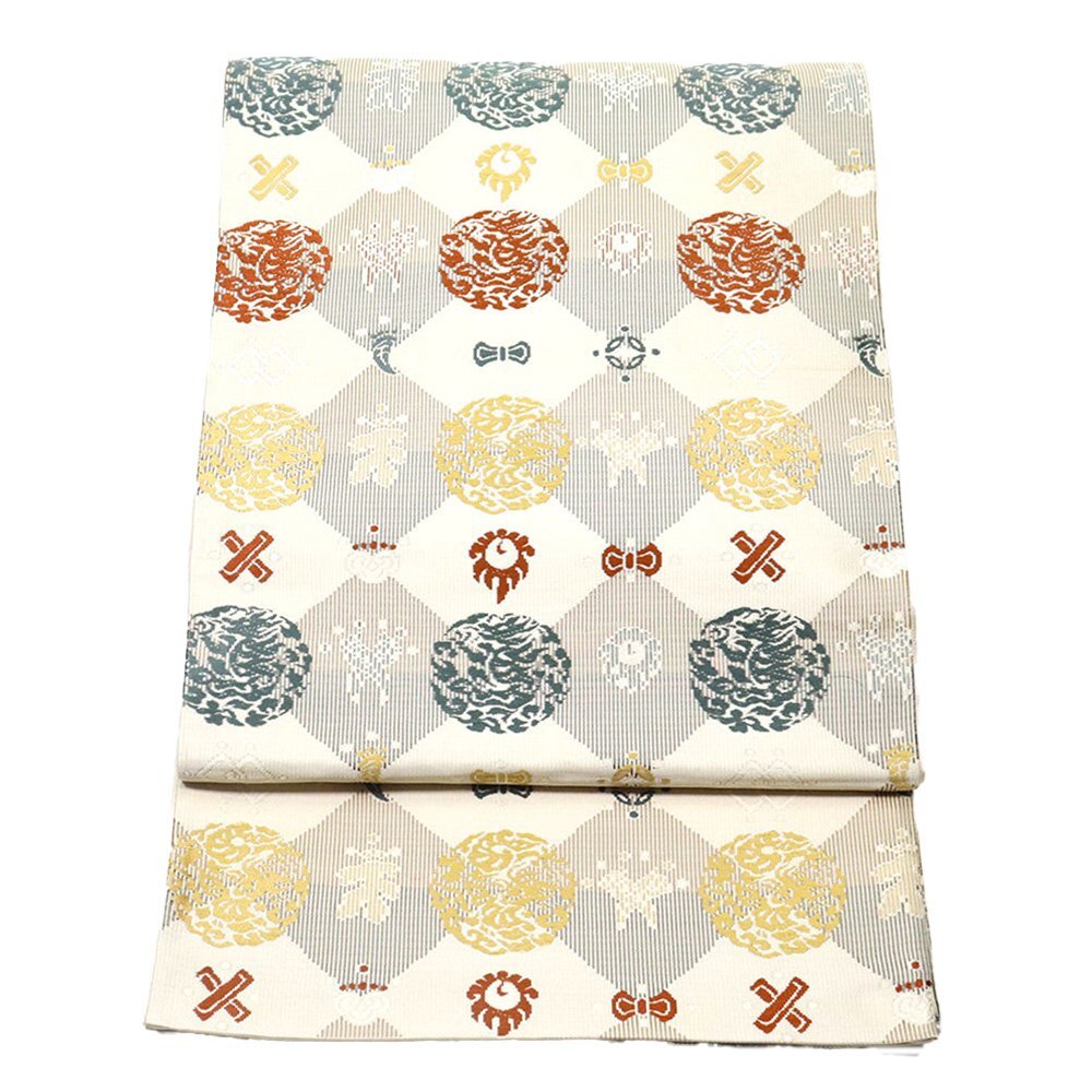 | 西陣織袋帯 ベージュ・緑・赤・金地 縫い取り華文・菱文・宝尽くし 全通 新品 仕立て上がり | |