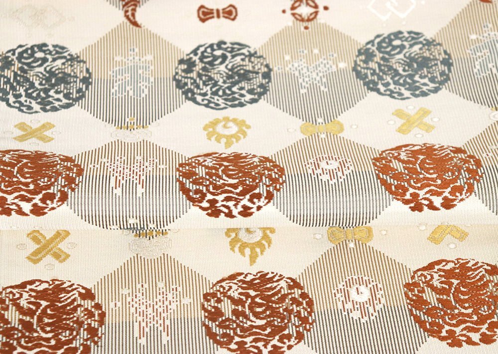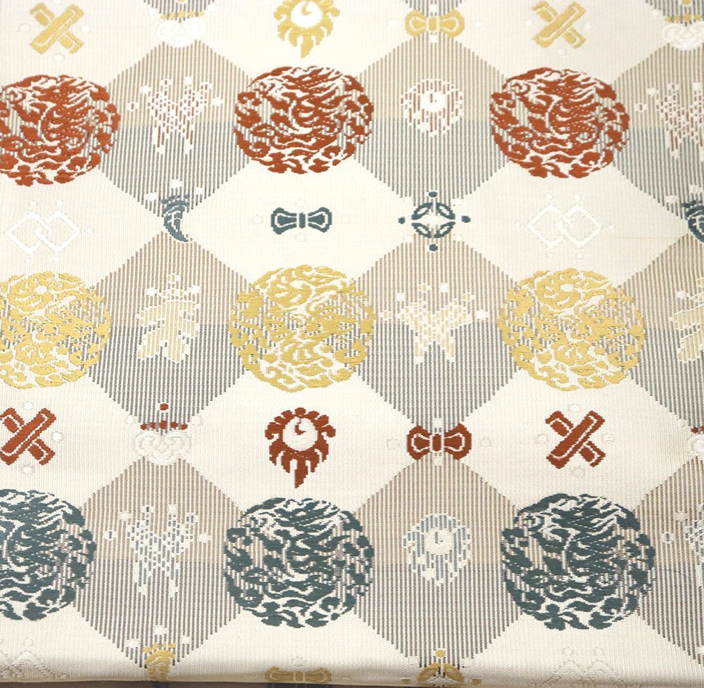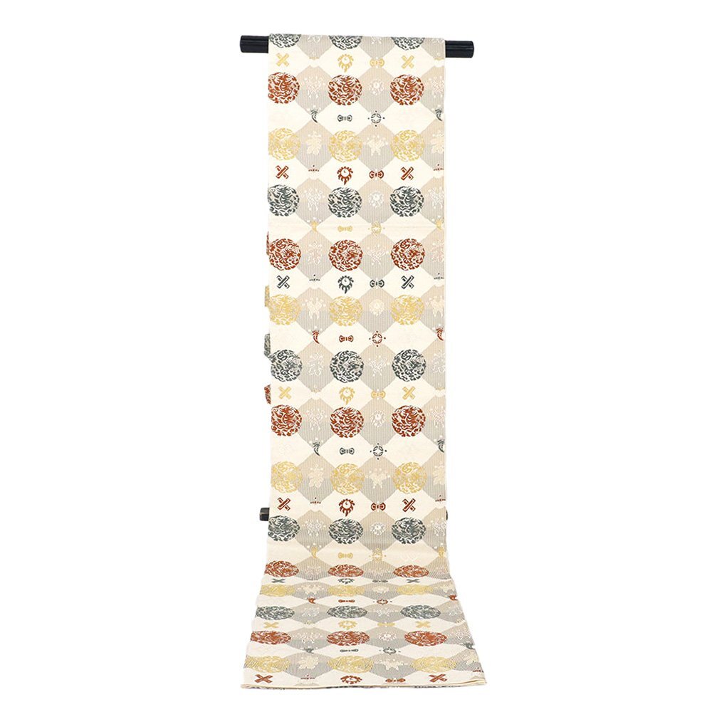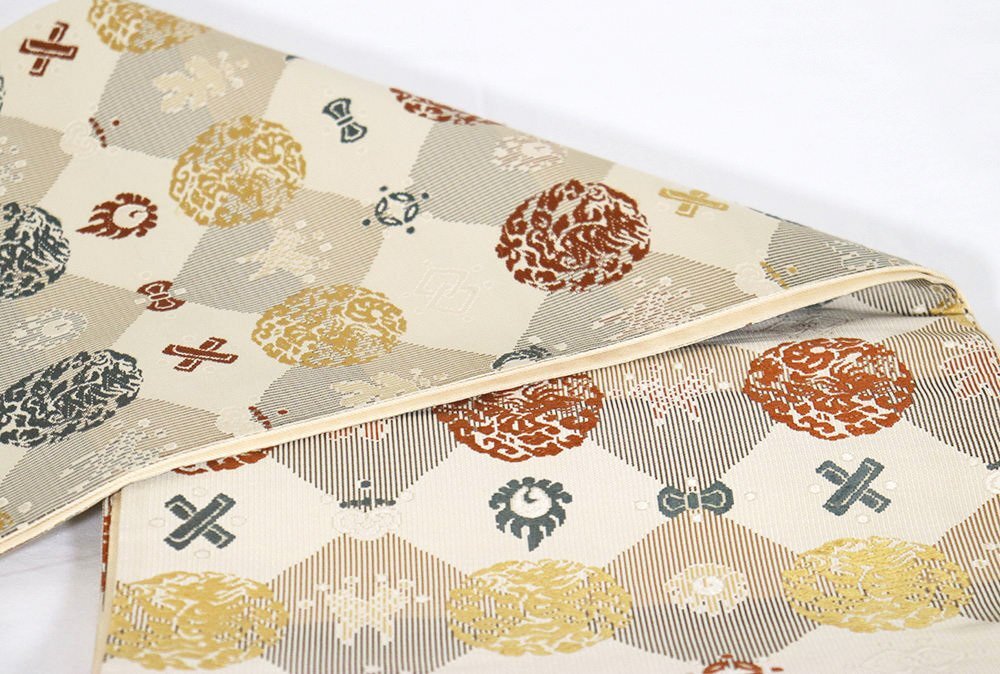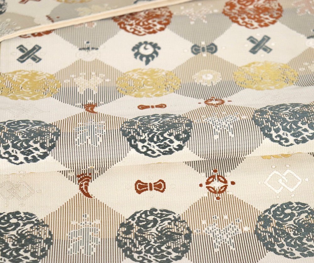| 西陣織袋帯 ベージュ・緑・赤・金地 縫い取り華文・菱文・宝尽くし 全通 新品 仕立て上がり | |