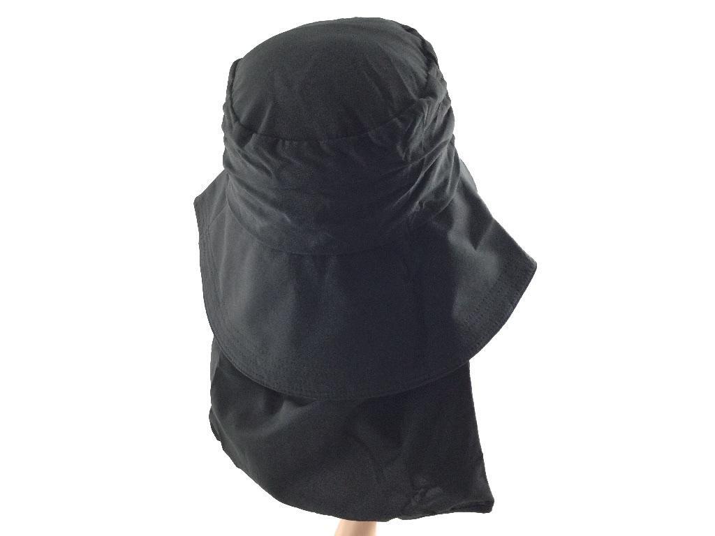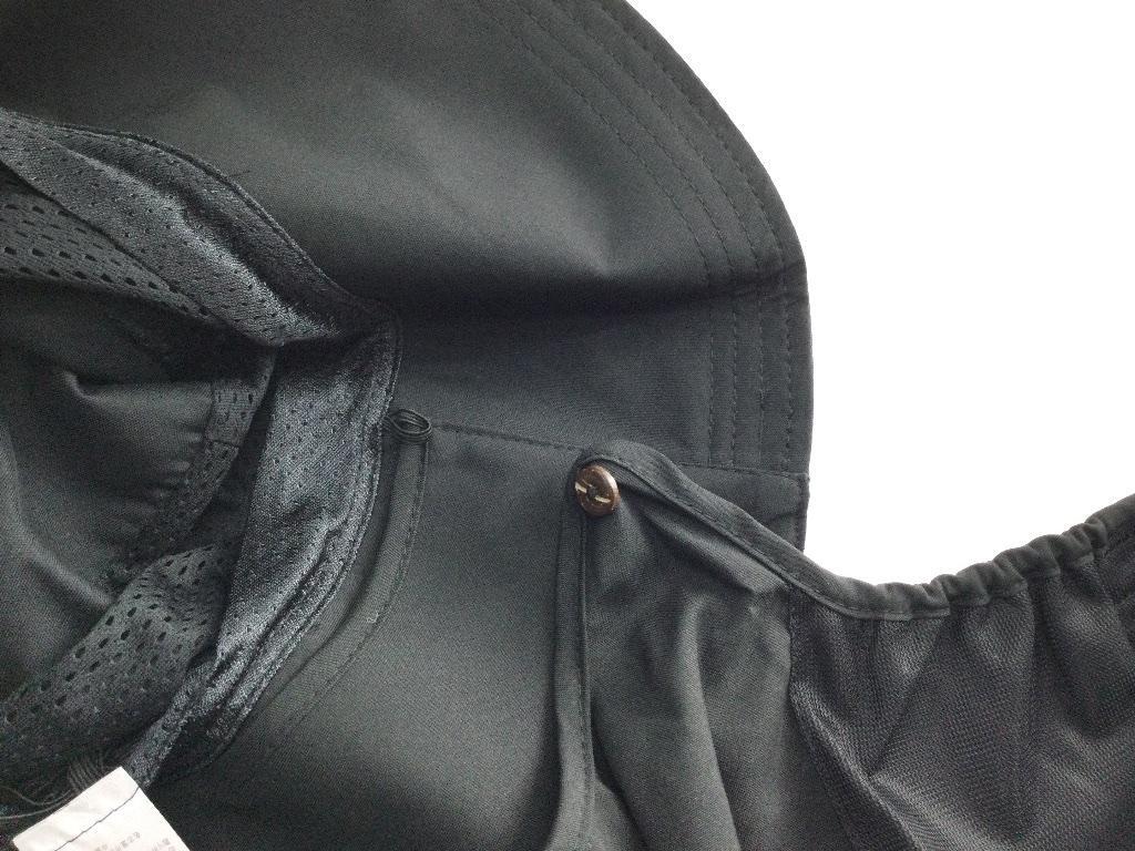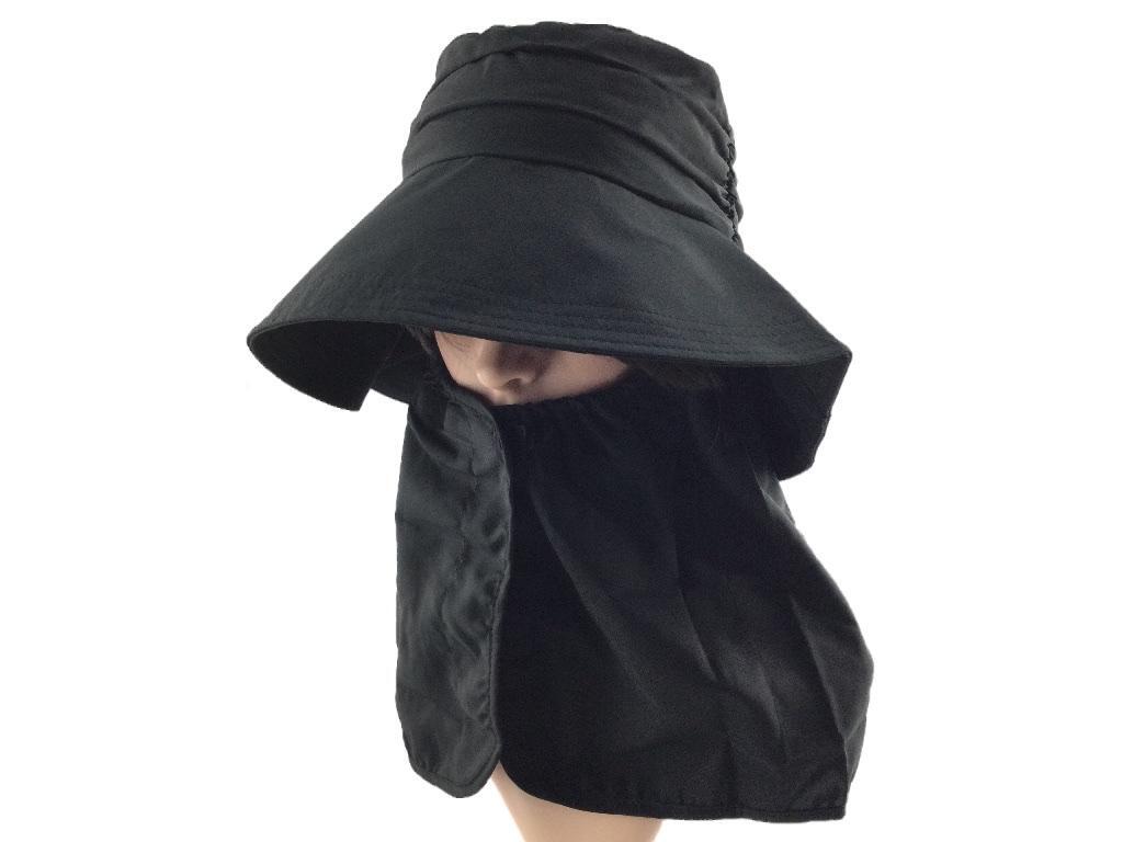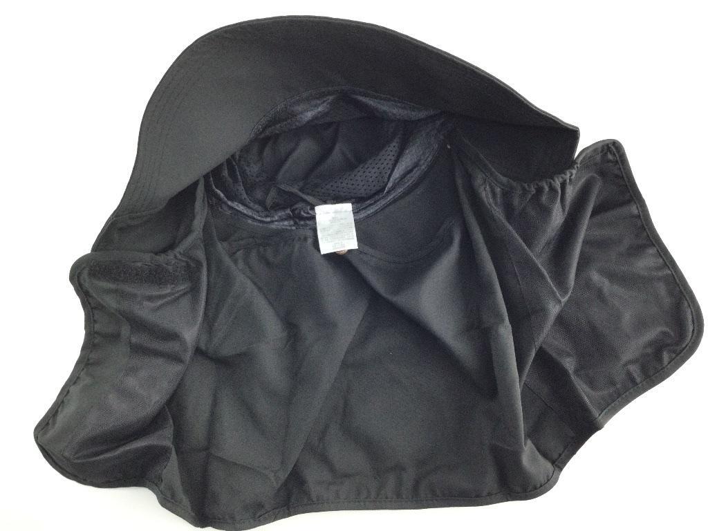 顔全体をしっかりカバーする広いつばと取り外し可能なシェード付き帽子。