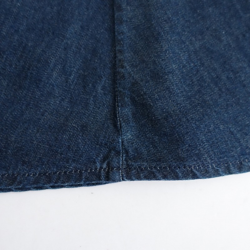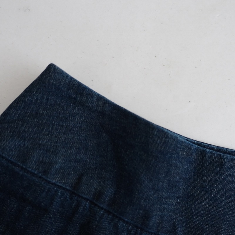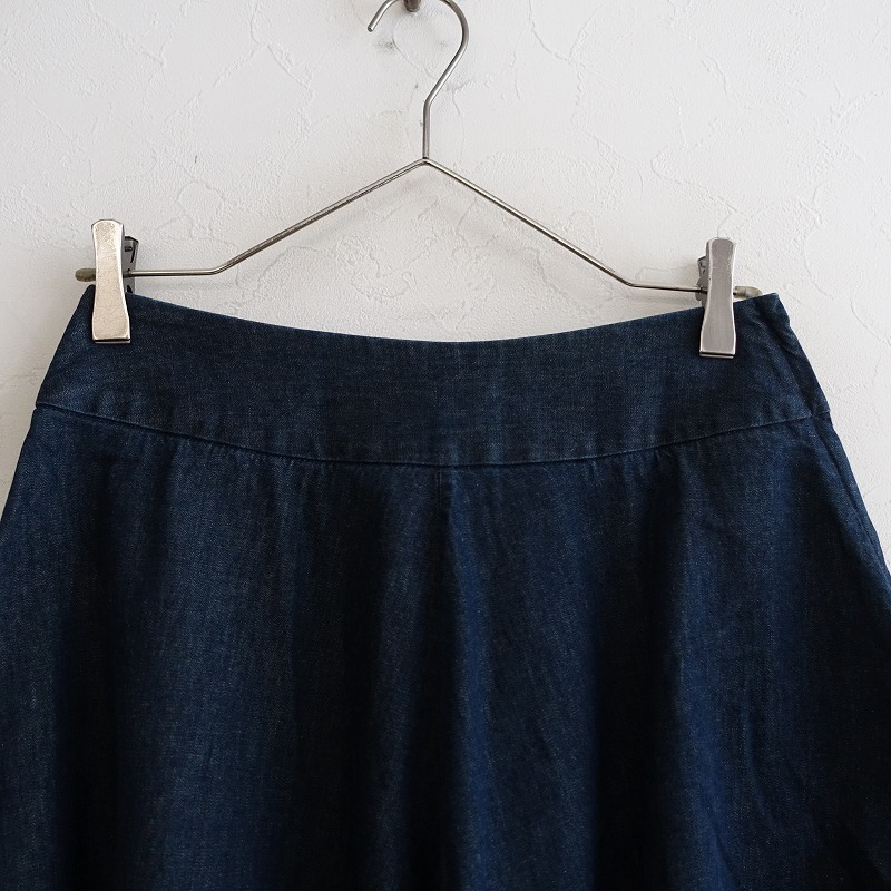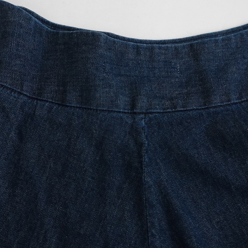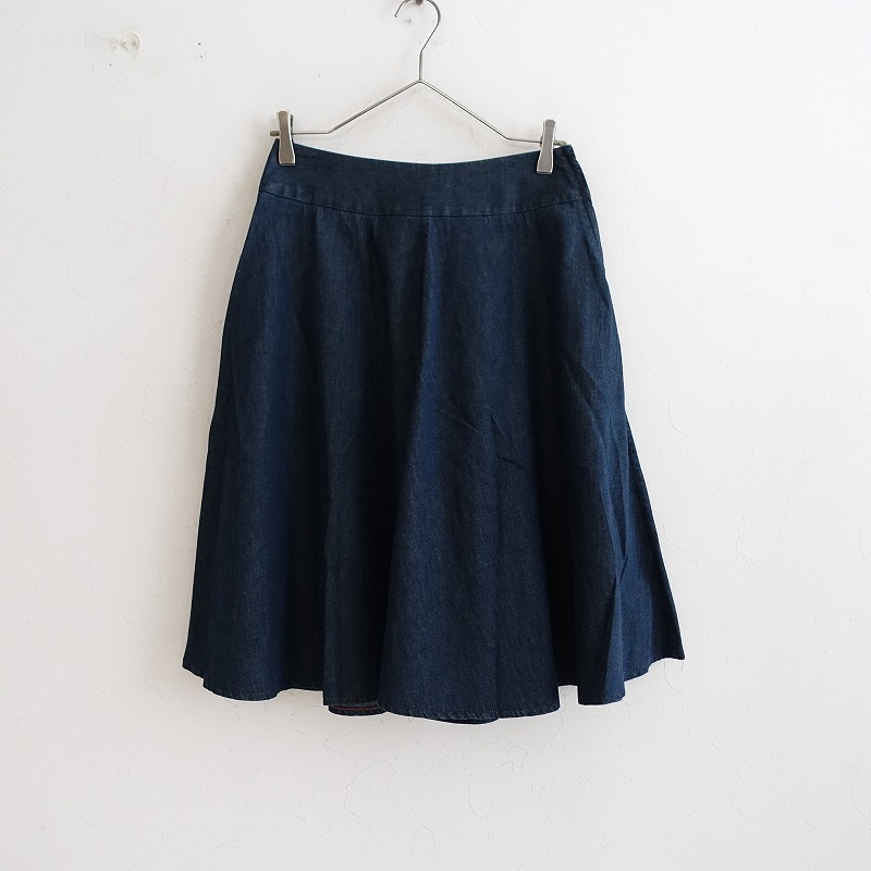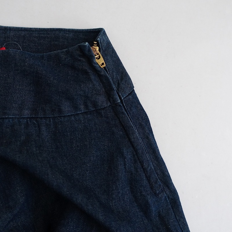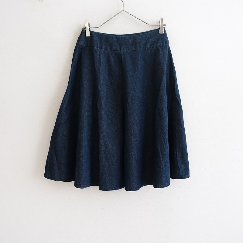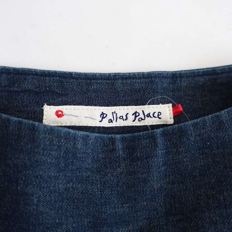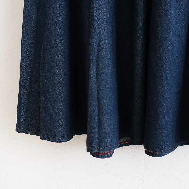 | Pal’las Palaceのデニムフレアスカートです。カラーはインディゴネイビーで、ダンガリーのようなライトなデニム地で仕立てられております。フレアなシルエットになっており、左サイドのファスナー開閉で着脱できます。 |