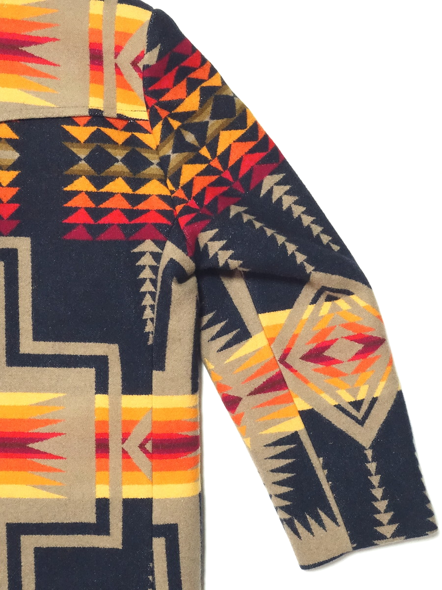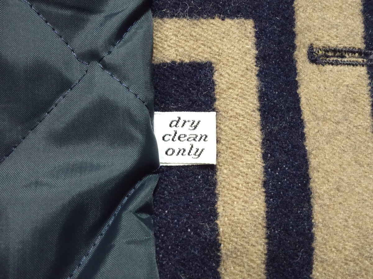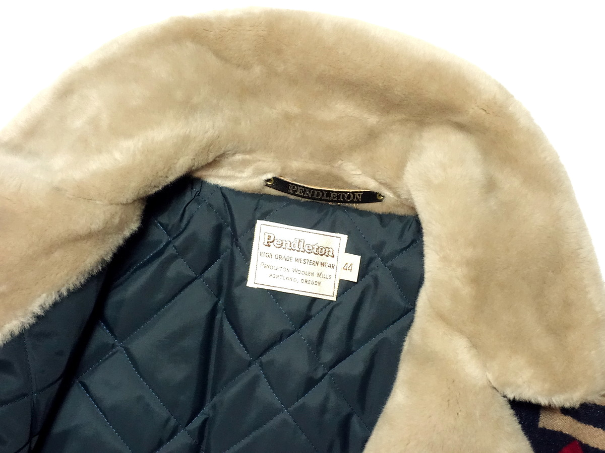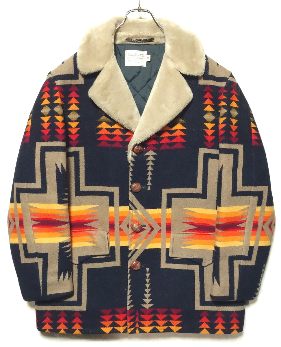 1970年代製と思われるPENDLETON「HIGH GRADE WESTERN WEAR」ラインのコートになります。 古いモデルのため、元々品質表示が付いておりませんが、表地は定番のブランケット生地と同様の生地感です。 また、表地のベースカラーはブラックではなくダークネイビーになります。 裏地はスムーズに着脱できる滑りの良いナイロン生地を使用しています。 しっかりと中綿の入ったキルティング生地を使用しているため、非常に保温性が高い仕上がりとなっています。 左胸には内ポケット付きで、同系色でも色合いの異なる生地を使用しています。 襟のボアはムートンではなく、ポリエステルなどの化繊になるかと思われます。 見た目通り暖かく、非常に柔らかく滑らかな質感で、襟周りのボリューム感もデザインのポイントになっています。 ボタンにはレザーのバスケットボタンを使用、ポケット部分はフラップの裏地がナイロン、 袋布にはソフトなフランネルを使用するなど、細部の保温性、デザイン性も抜かりない作りです。 形はバックがウエスタンヨークになったデザインとウエストを少し絞ったウエスタンタイプのきれいな形になります。 すっきりとした形でもウールの表地とキルティングの裏地で真冬のアウターとしても充分に活躍する保温性です。 更に滑らかな素材感の裏地を使用しているため、インナーに厚手のアイテムを合わせやすい作りになっています。 状態は使用感の見られないヴィンテージ品になります。 おそらく未使用品か着用回数の極端に少ないお品物になるかと思われます。 表地にはヴィンテージ品特有の古びた風合いがございますが、着用感はなく、 虫食いや日焼け、変色なども見られない大変良好な状態です。 ボタンには黒ずみや擦れなどの経年変化が見られますが、ダメージや素材の劣化はございません。 襟のボアや裏地の汚れや使用感もなく、アームや袖口も非常にきれいです。 タグの書き込み、切れ込みもなく、レザータグの印字の薄れなども見られません。 細部にも特に問題は見られず、年代物の古着では滅多に見られない良好な状態となっております。 |