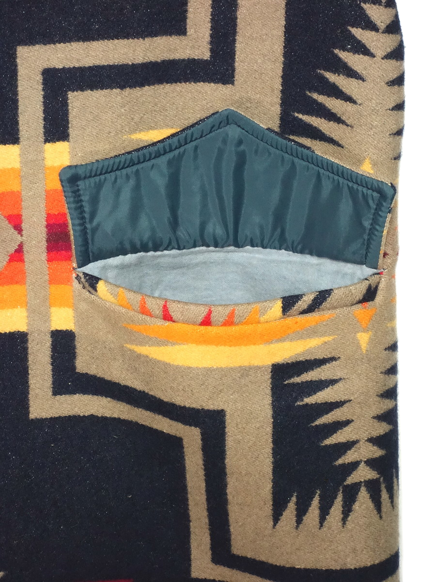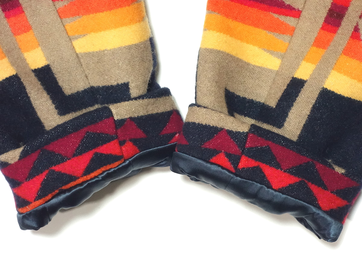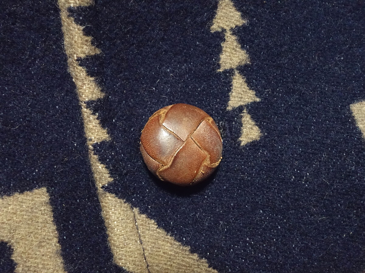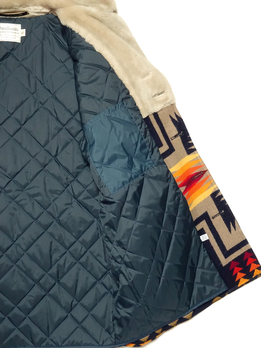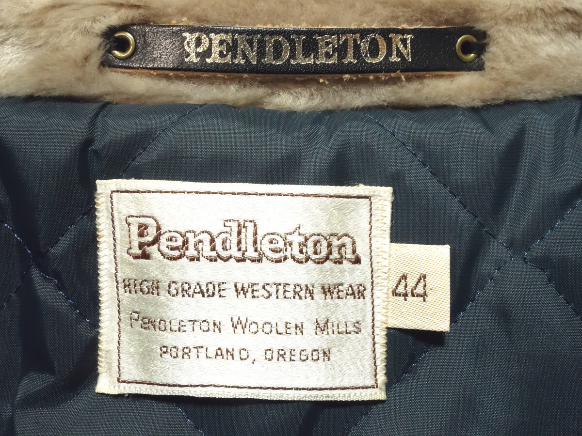 1970年代製と思われるPENDLETON「HIGH GRADE WESTERN WEAR」ラインのコートになります。 古いモデルのため、元々品質表示が付いておりませんが、表地は定番のブランケット生地と同様の生地感です。 また、表地のベースカラーはブラックではなくダークネイビーになります。 裏地はスムーズに着脱できる滑りの良いナイロン生地を使用しています。 しっかりと中綿の入ったキルティング生地を使用しているため、非常に保温性が高い仕上がりとなっています。 左胸には内ポケット付きで、同系色でも色合いの異なる生地を使用しています。 襟のボアはムートンではなく、ポリエステルなどの化繊になるかと思われます。 見た目通り暖かく、非常に柔らかく滑らかな質感で、襟周りのボリューム感もデザインのポイントになっています。 ボタンにはレザーのバスケットボタンを使用、ポケット部分はフラップの裏地がナイロン、 袋布にはソフトなフランネルを使用するなど、細部の保温性、デザイン性も抜かりない作りです。 形はバックがウエスタンヨークになったデザインとウエストを少し絞ったウエスタンタイプのきれいな形になります。 すっきりとした形でもウールの表地とキルティングの裏地で真冬のアウターとしても充分に活躍する保温性です。 更に滑らかな素材感の裏地を使用しているため、インナーに厚手のアイテムを合わせやすい作りになっています。 状態は使用感の見られないヴィンテージ品になります。 おそらく未使用品か着用回数の極端に少ないお品物になるかと思われます。 表地にはヴィンテージ品特有の古びた風合いがございますが、着用感はなく、 虫食いや日焼け、変色なども見られない大変良好な状態です。 ボタンには黒ずみや擦れなどの経年変化が見られますが、ダメージや素材の劣化はございません。 襟のボアや裏地の汚れや使用感もなく、アームや袖口も非常にきれいです。 タグの書き込み、切れ込みもなく、レザータグの印字の薄れなども見られません。 細部にも特に問題は見られず、年代物の古着では滅多に見られない良好な状態となっております。 |