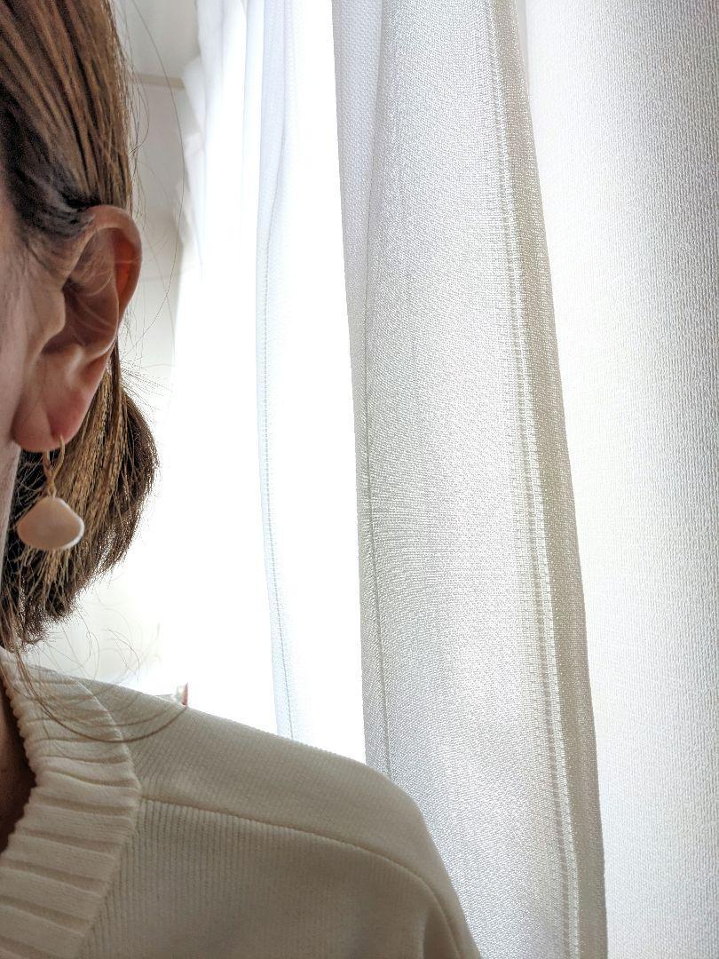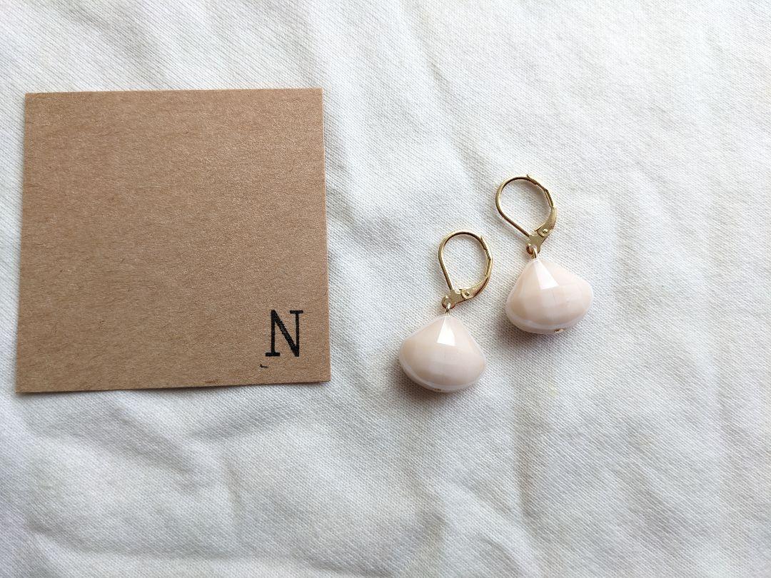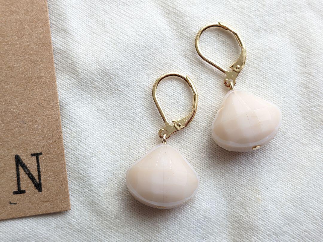 シェル型ガラスビーズピアスです。ベージュカラーで肌馴染み賀いいです。セーターやロングワンピース、ジャケットなどに。