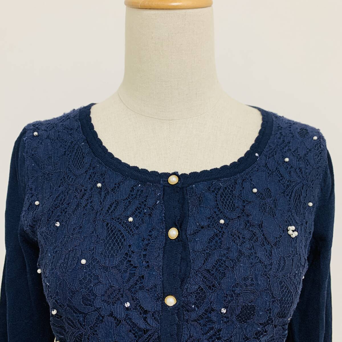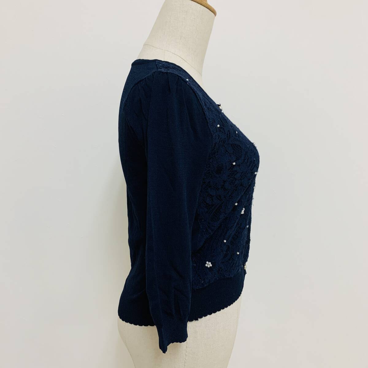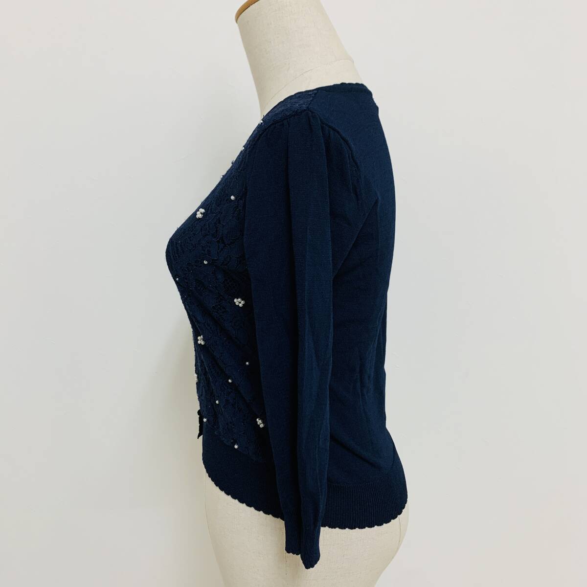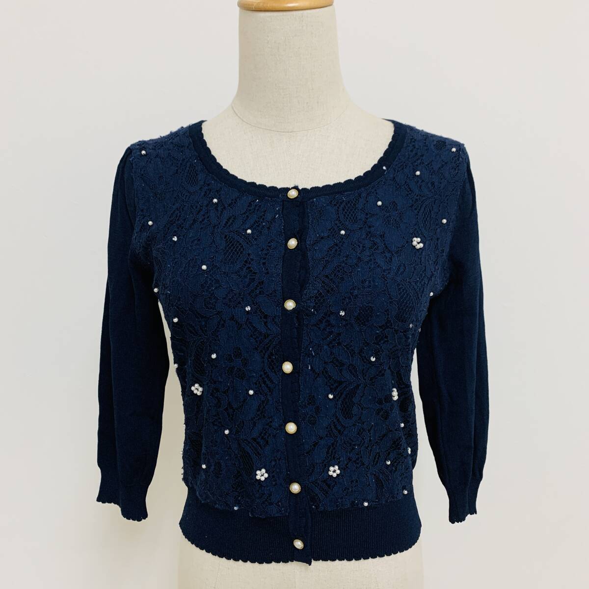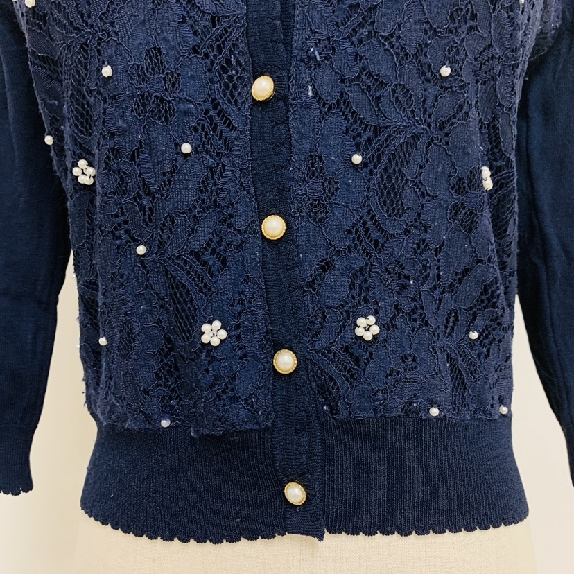 YH2276 May Pretty レディース 七分袖 カーディガン ビジュー レース 丸首 袖裾リブ ネイビー 紺 Mサイズ ガーリースタイル 万能 USED 古着