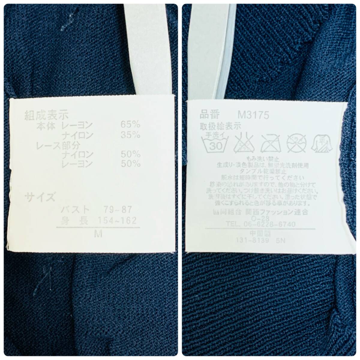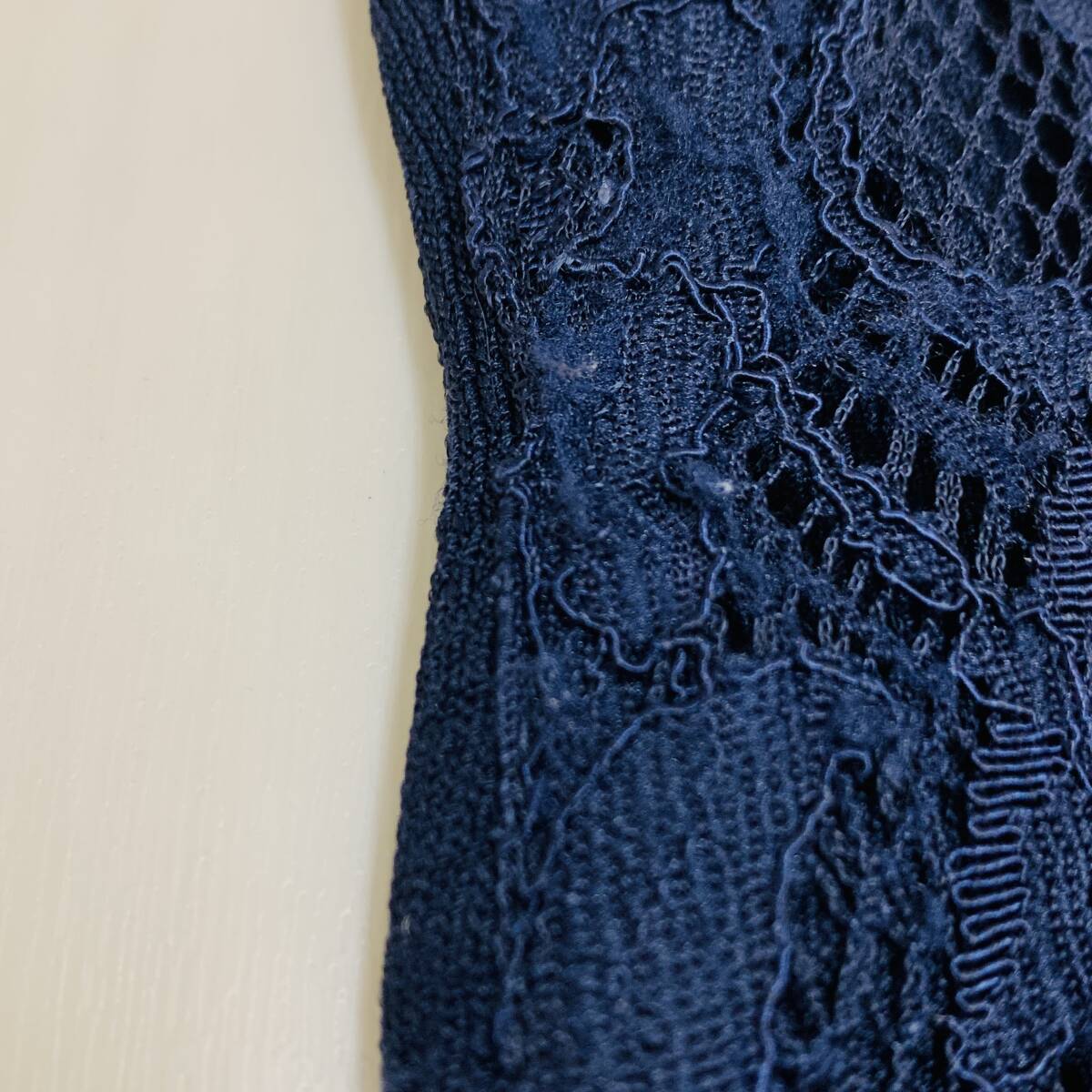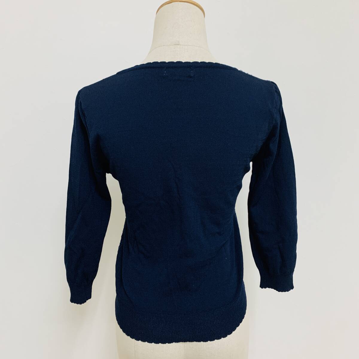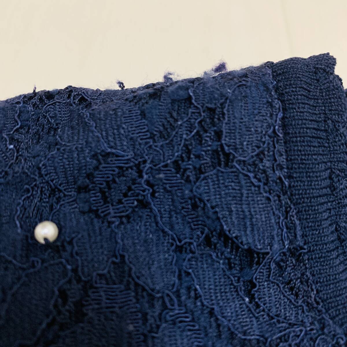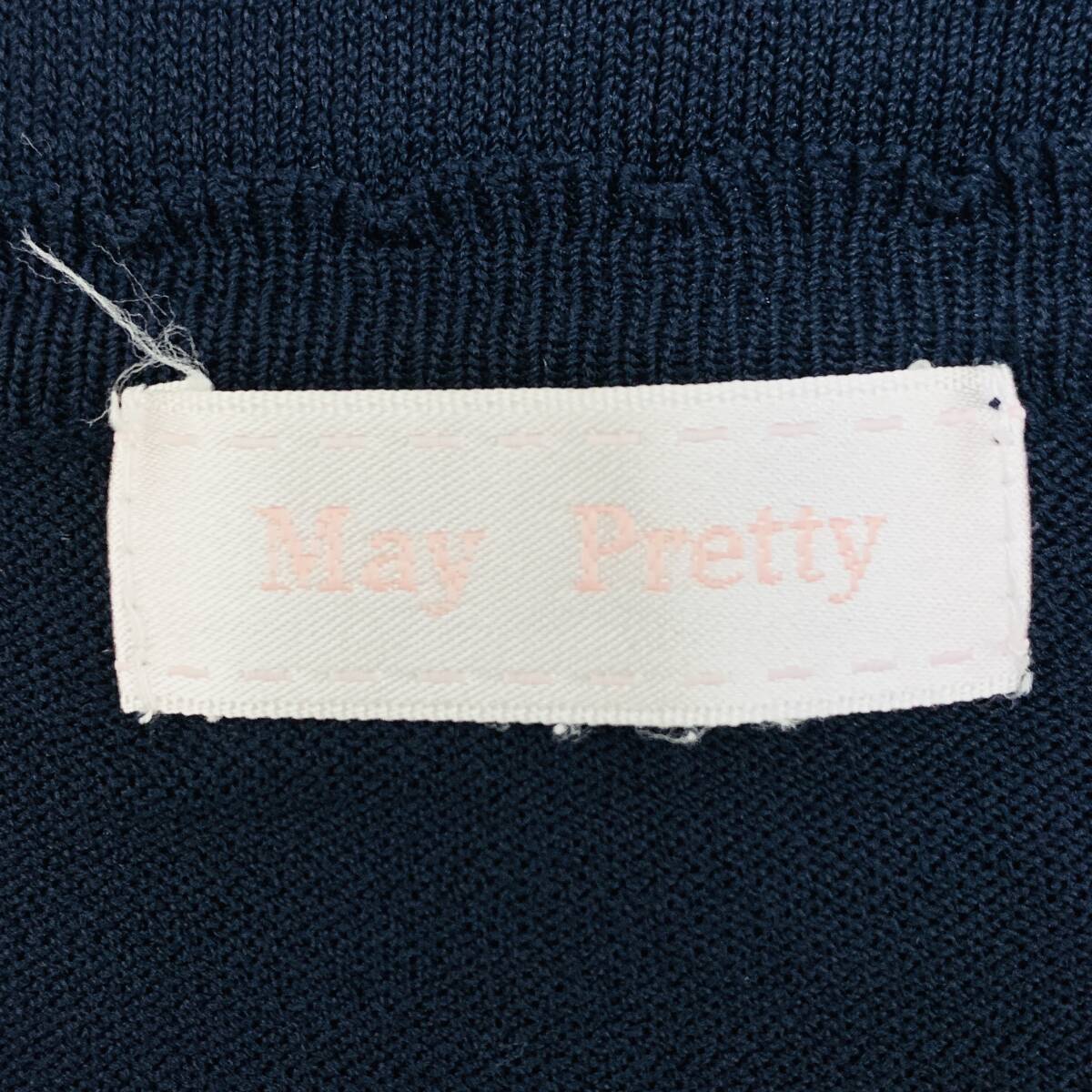YH2276 May Pretty レディース 七分袖 カーディガン ビジュー レース 丸首 袖裾リブ ネイビー 紺 Mサイズ ガーリースタイル 万能 USED 古着