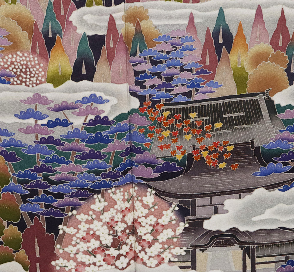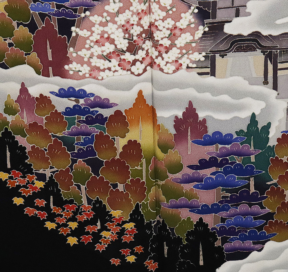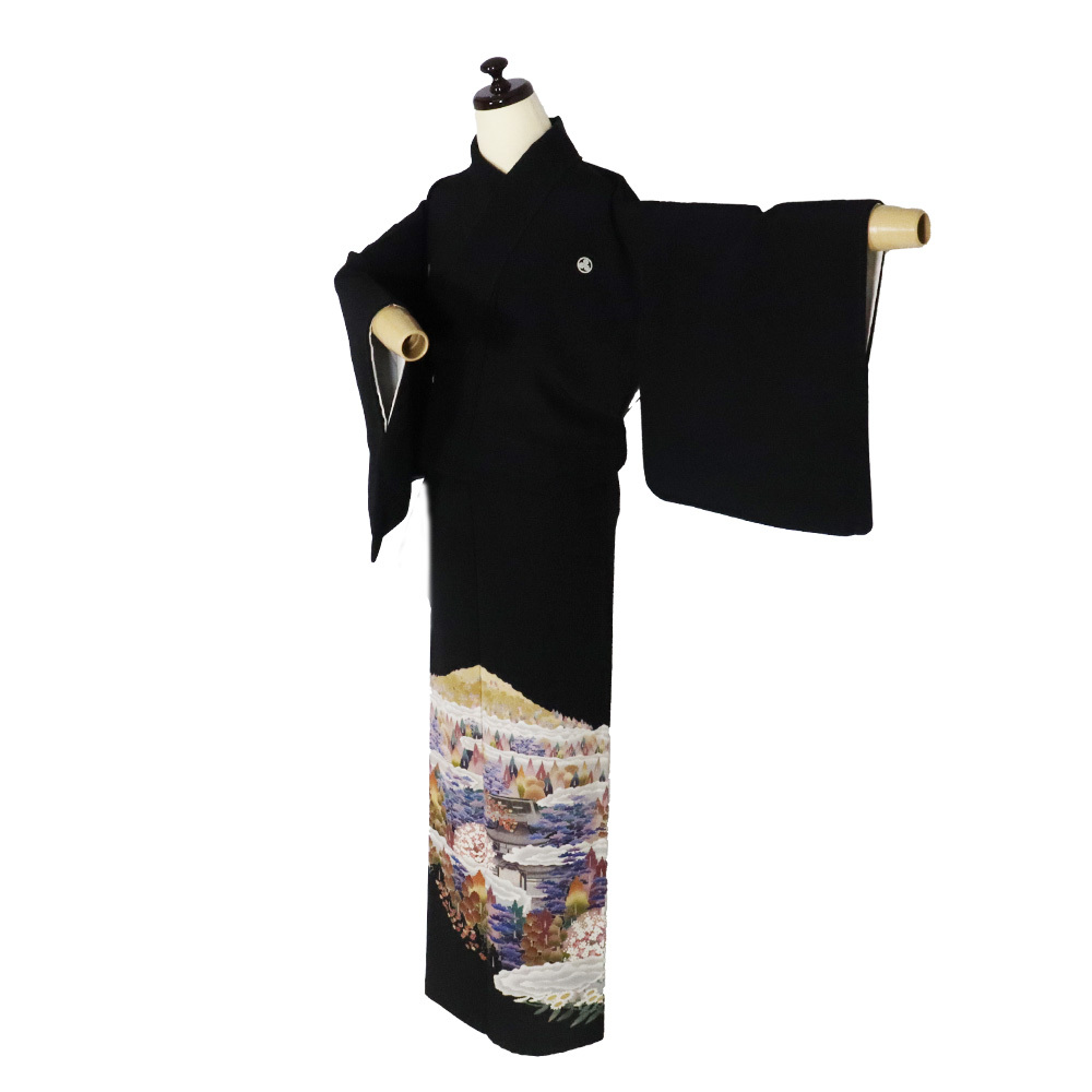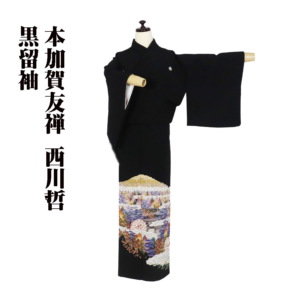 | 本加賀友禅 前川哲氏作 黒留袖 袷 濱縮緬地 黒暈し地 遠山・松竹梅・仏閣 157 広襟 比翼仕立て 作家落款入り | |
