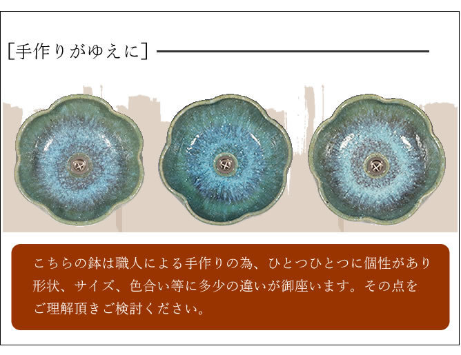 ご注意 | 手作りの為、サイズ、重量、釉薬の掛かり方などに必ず誤差が御座います。 特に色の出方は様々となります。 手作りの特徴としてお考え下さいませ。 |