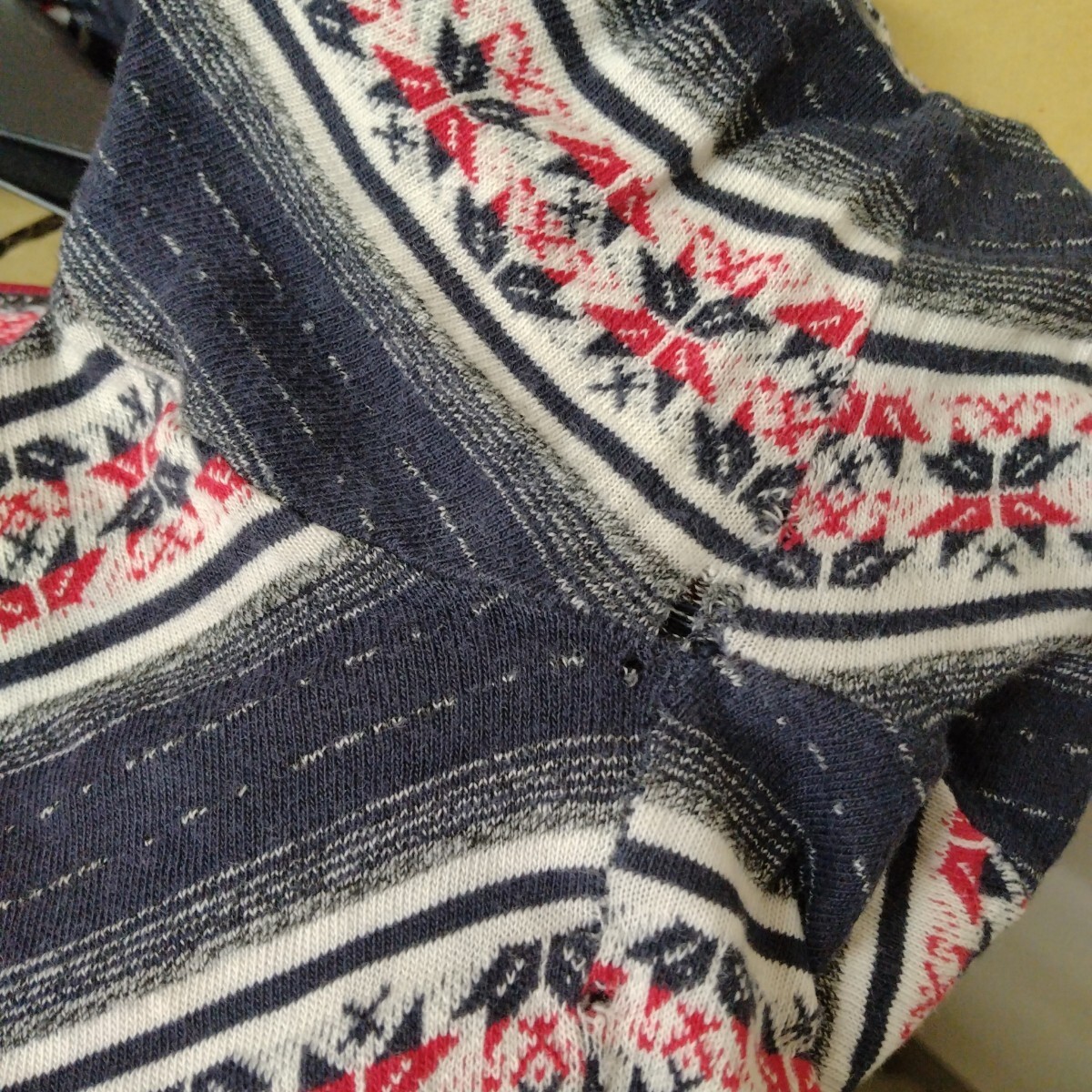 ・状態についてですが、左袖口部分のリブ縫製部には少々ほつれがあり、その他のリブ含め全体的によれが感じられます。あとは画像に載せたように両脇付近にほつれが数箇所ありますのでご留意ください。その他着用の妨げになりそうなダメージ、汚れはおそらくはないのではと思われます。
