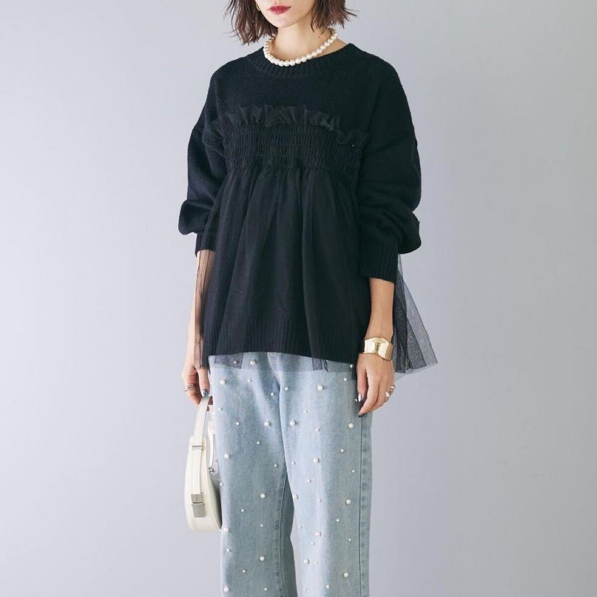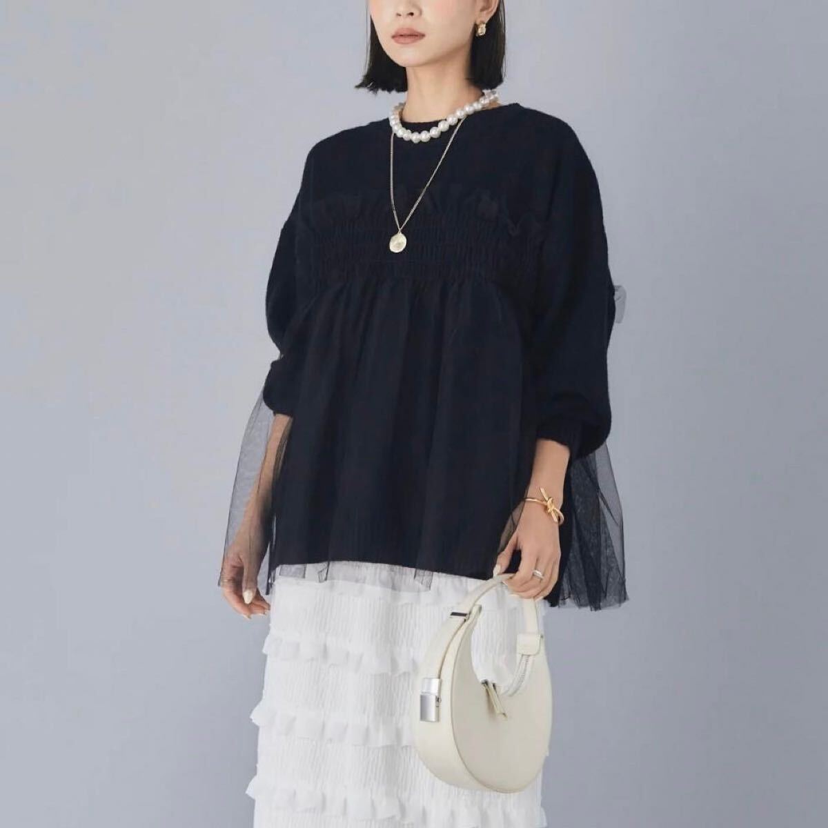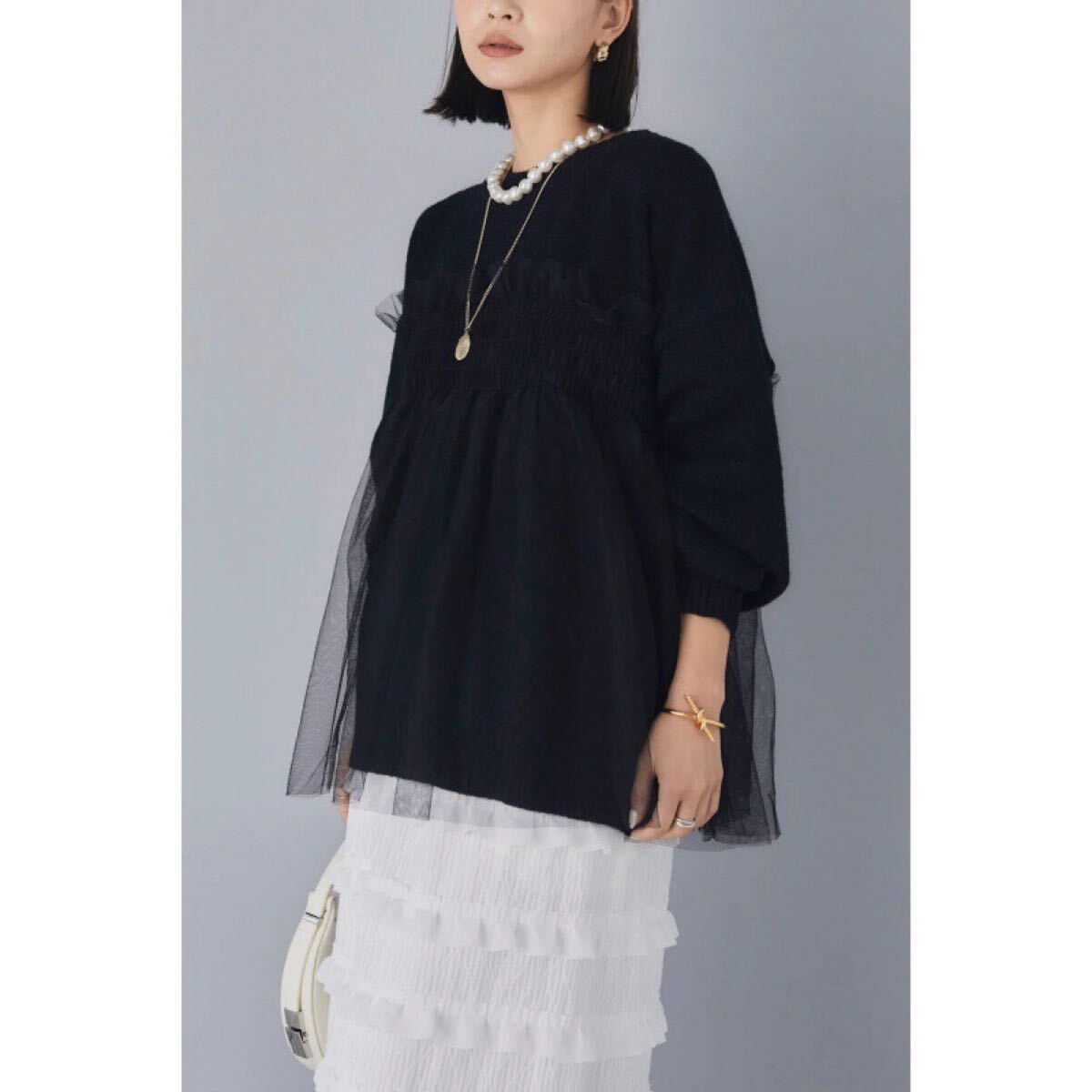 柔らかなニット素材と胸元から裾にかけて広がる繊細なチュールが融合したフェミニンなトップスです**