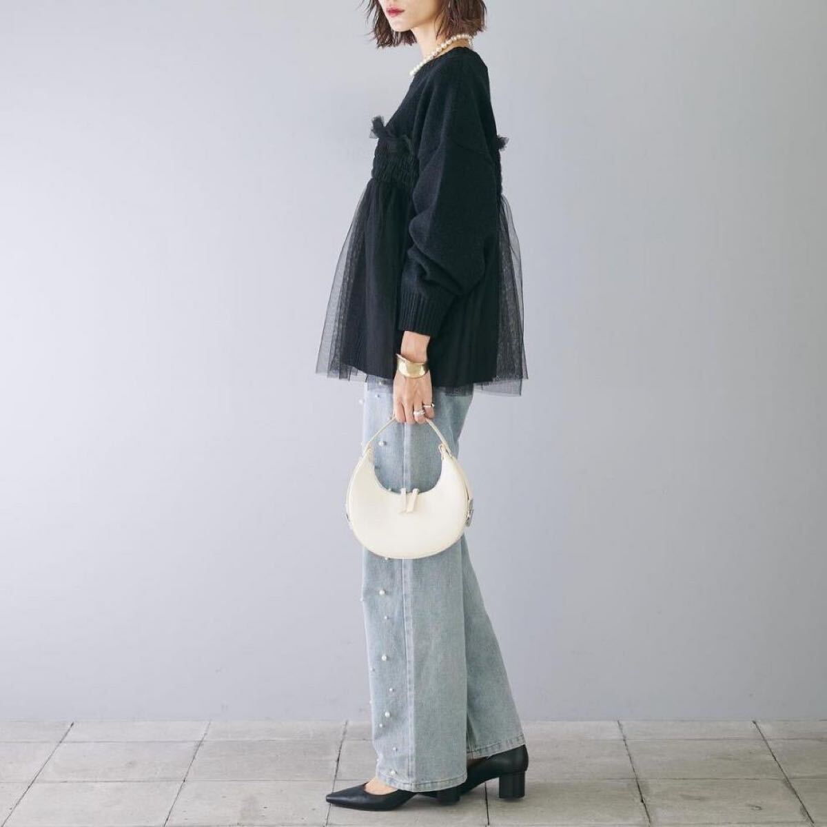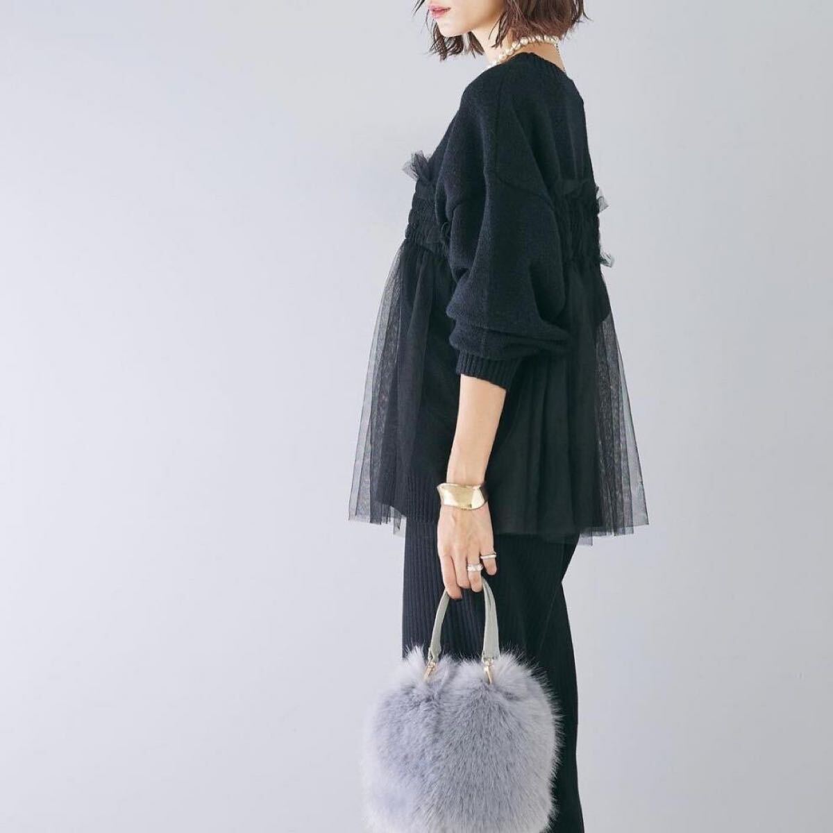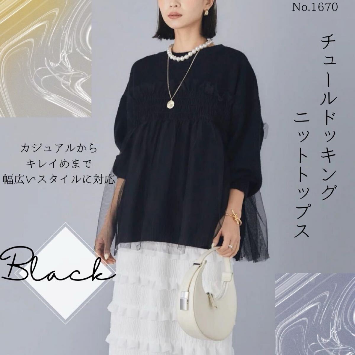 柔らかなニット素材と胸元から裾にかけて広がる繊細なチュールが融合したフェミニンなトップスです**
