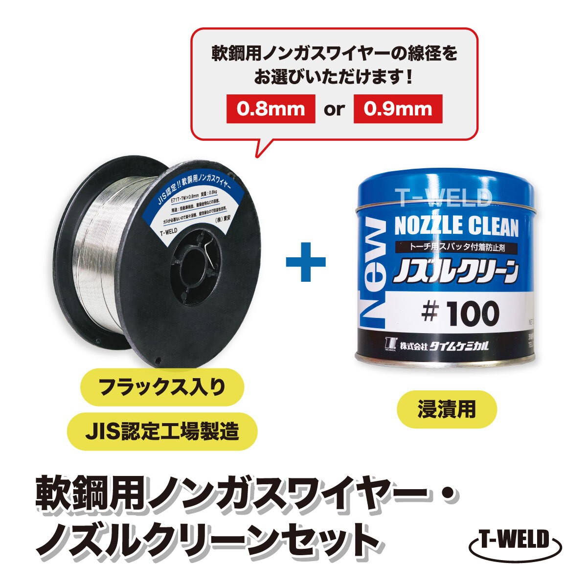 軟鋼用 ノンガスワイヤー ( フラックス入り )E71T-TW ( 0.8mm・0.9mm ) 0.8kg/巻 +ノズルクリーン #100 1缶 セット商品