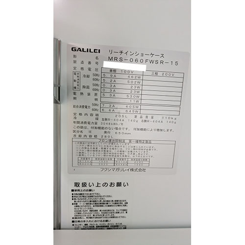【業界最長1年保証】冷凍リーチインショーケース 290L フクシマガリレイ(福島工業) MR-060FWSR-15 業務用 中古/送料別途見積