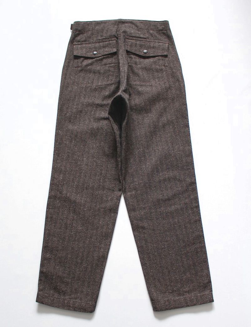ネップ入りのヘリンボーン素材で、前はジップフライ、ウェービングベルト、