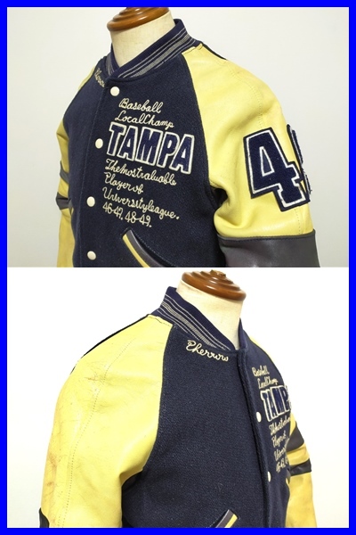 送料無料でお送りいたします(同梱不可)。 カラー:ダークネイビー×クリーム サイズ:SMALL(日本規格サイズ) 【実寸】 着丈 56 袖丈 ラグランスリーブ 肩幅 ラグランスリーブ 身幅 54 (当方素人採寸による実測のため、多少の誤差があるかと思います。ご容赦下さい。) ■ランク:C ■備考 ※古着スタジャンとして程よいUSED感で着やすいです。 ※通常使用によるレザー部の塗料剥がれ箇所ありです(画像あり)。 ※袖リブに2か所ずつリペア痕ありです(画像あり)。 ※他には特に目立つ汚れやダメージはなく、状態はまずまずです。 ※素材表記なしで詳細は不明ですが、恐らくはブレンドウールとホースレザーです。 ※生地はブレンドウール地とレザーの切替で、羽織りごこちよく着心地抜群です。 ※Pherrow’sの正規品です。 ※定番アイテムですので流行にとらわれず永く愛用いただけます。 ※完璧なお品をお求めの方、また中古品にご理解のない神経質な方におきましては、 恐れ入りますがご入札をお控え頂けますようお願い申し上げます。 -------------------------------------------- N:新品 S:未使用or新品同様のお品 A:コンディション良好な美品 B:使用感の有るまずまず良好なお品 C:全体的に使用感の有るお品 D:状態が悪く強い使用感の有るお品 J:ジャンク品or難有り品 ザ・リアルマッコイズ設立メンバー三名のうちのひとり志村昌洋が 1991年にフェローズ(Pherrow's)を設立した。 「流行に左右されないモノ創り」、 「10年、20年後にヴィンテージと呼ばれるモノ創り」 をテーマとしたオリジナリティ溢れるアメカジブランドである。 「Lucky Pherrow」という架空の人物を想定し、 彼のライフスタイルを提案するというコンセプトで誕生した。 当初は主にヴィンテージスウェットやフライトジャケットの復刻をする ブランドであったが、現在ではストーミーブルー(ウエスタン、ワーク系)、 シーシーマスターズ(ミリタリー系)、バンブルビー(モーター・サイクル系)、 マヒマヒライダー(サーフ系)といった、テーマ別に数種類のブランドを展開し、 多岐に亘るアメカン・カジュアルウェアを手掛けている。 近年ではそれら細分化したブランドをふたたびフェローズへと統合し、 ブランドを統一化する一方で、値ごろ感のある価格を維持する為に 積極的に中国で生産する方向性も見せ、 ヴィンテージウェアのレプリカの範疇には止まらない展開も見せている。 | |