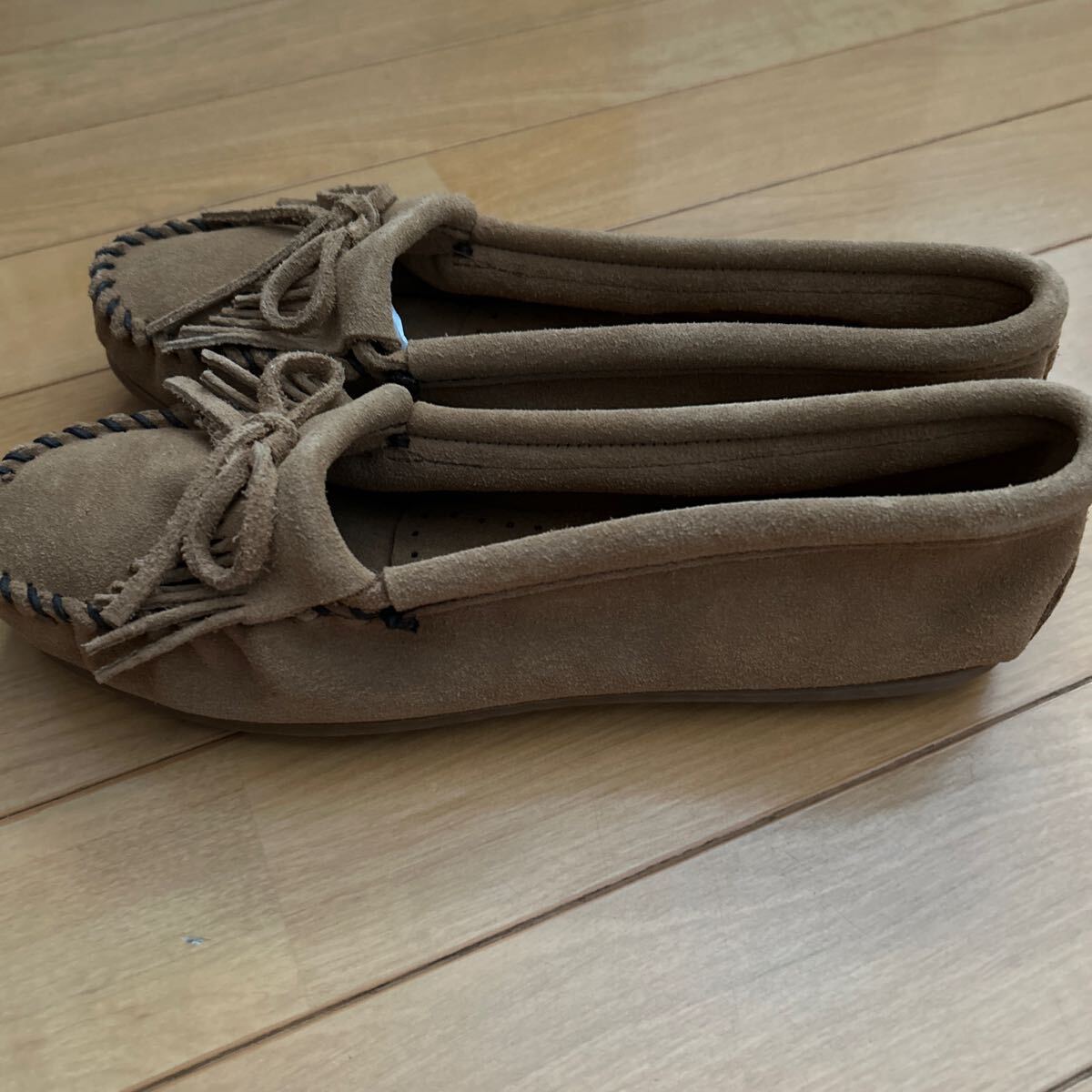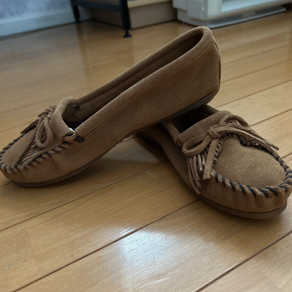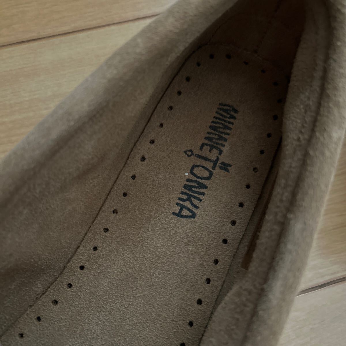 フリンジ付きのベージュスエードモカシン、フラットヒールで快適な履き心地。
