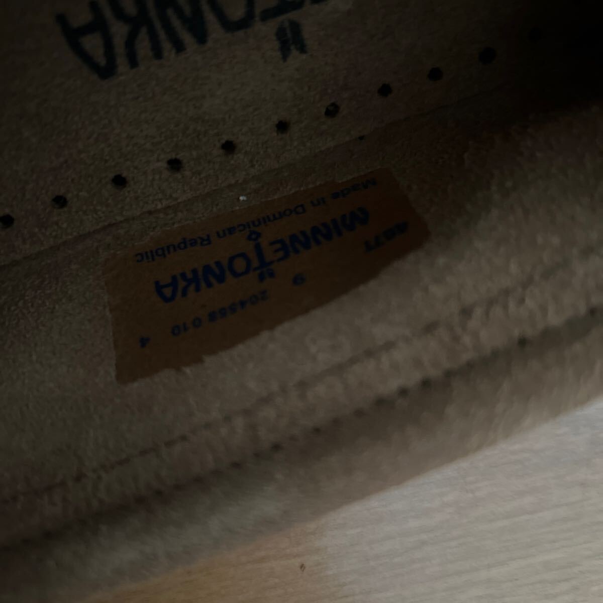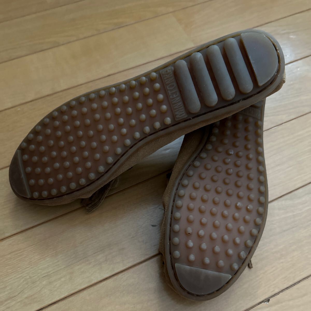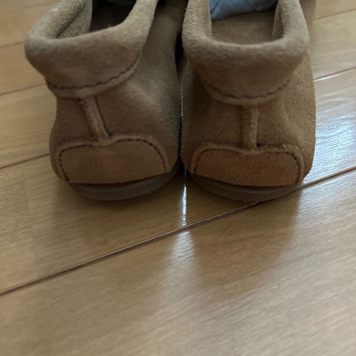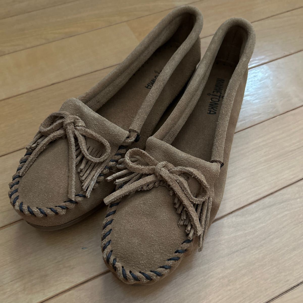 フリンジ付きのベージュスエードモカシン、フラットヒールで快適な履き心地。