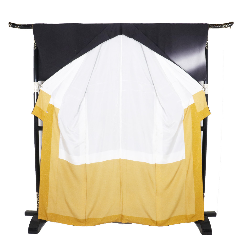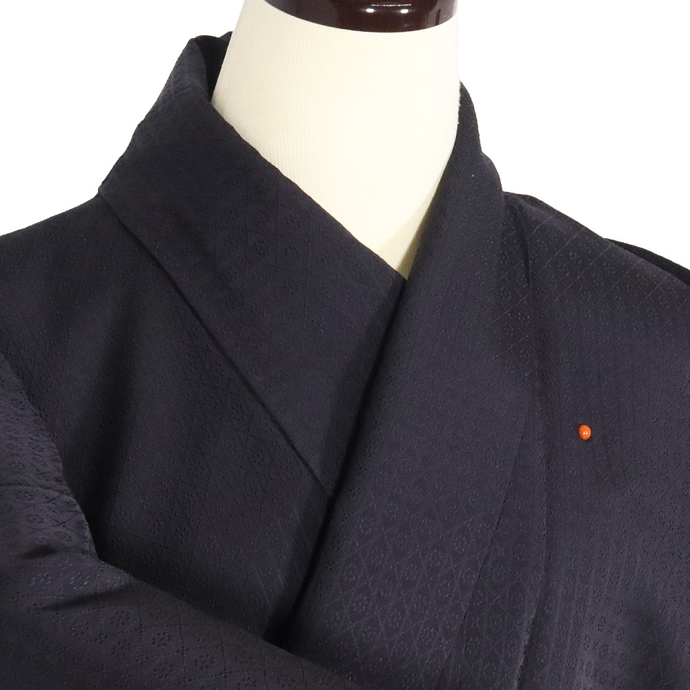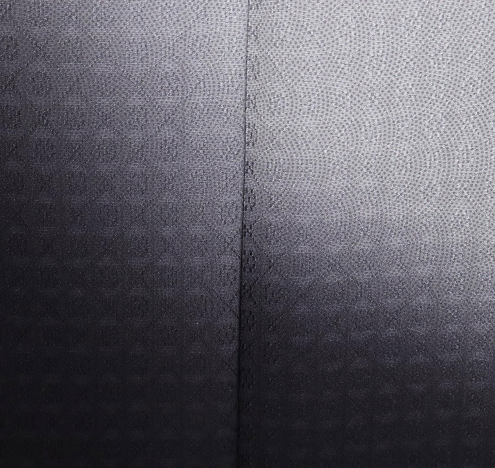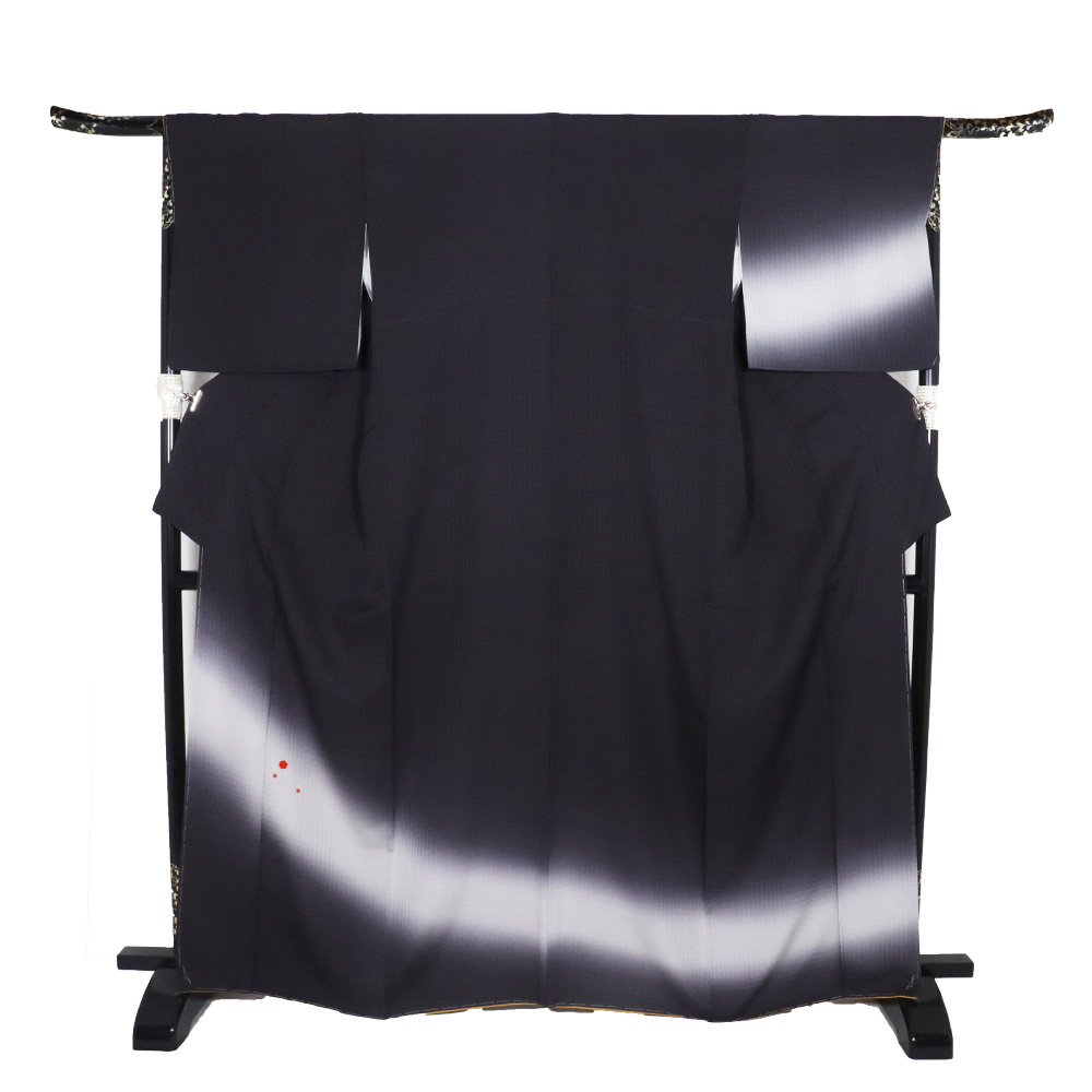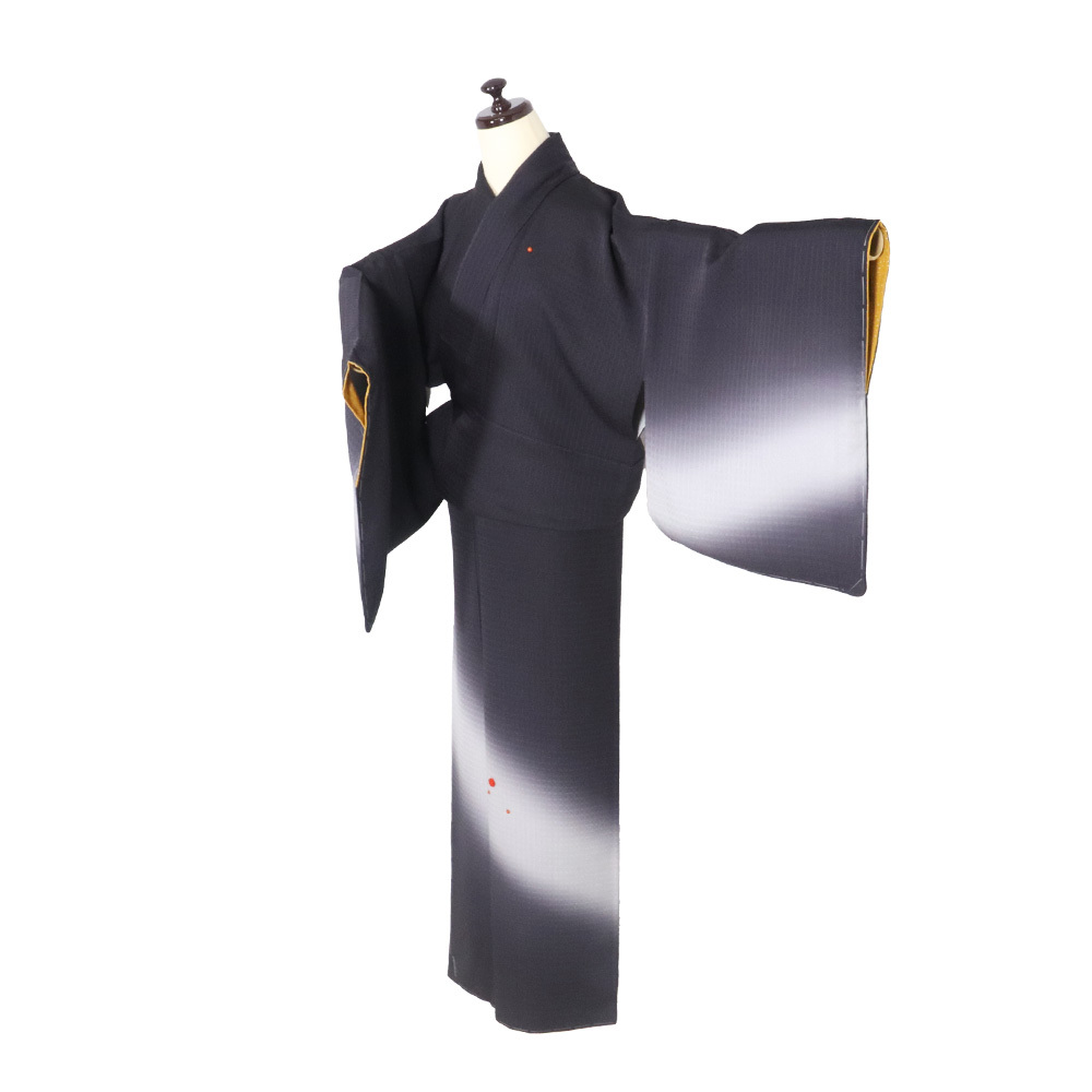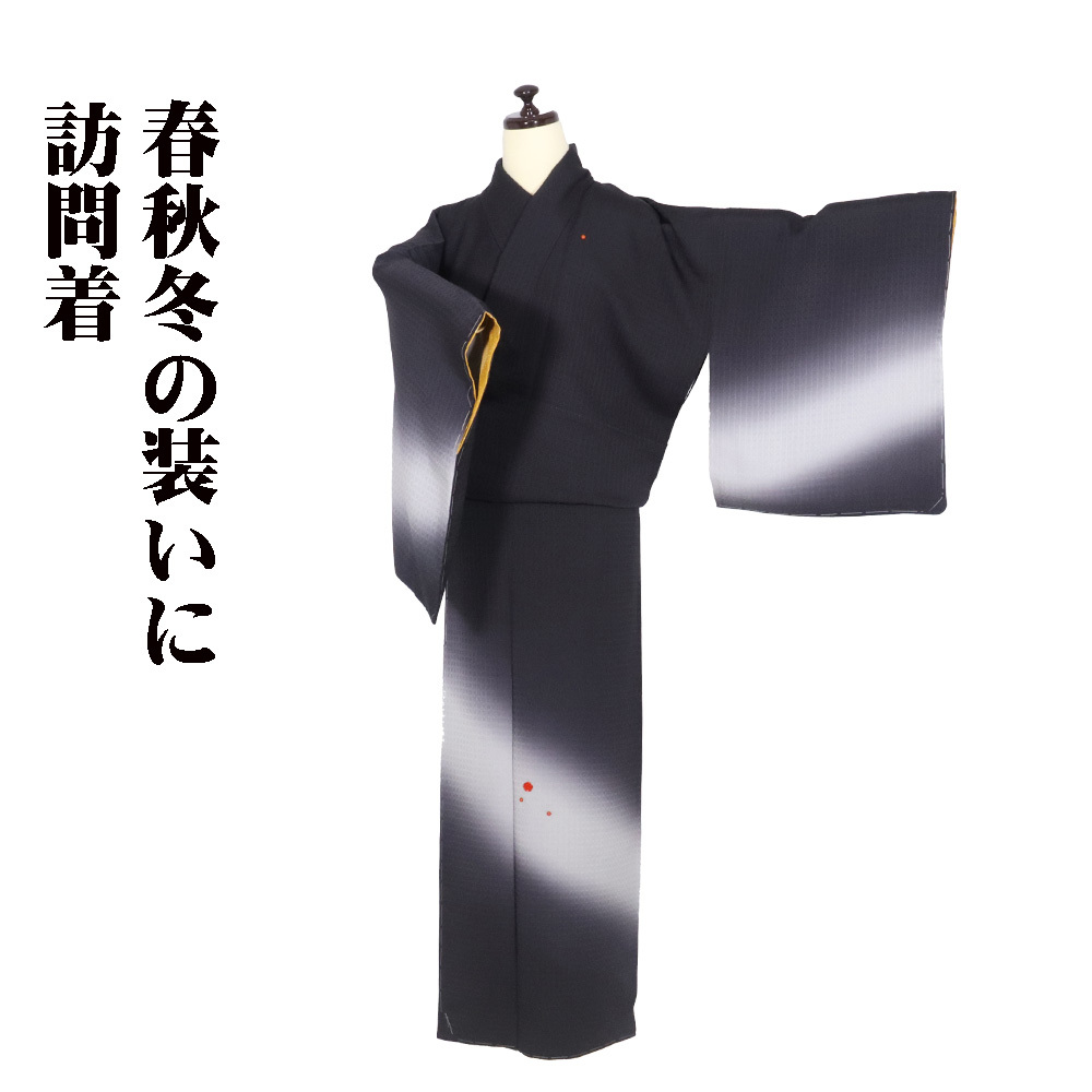 | 訪問着 袷 丹後縮緬地 黒(黒檀色)・ライトグレー(絹鼠色)暈し地 花織風地模様地 薔薇・ビーズ 174 広襟 15号 仕付け付き | |