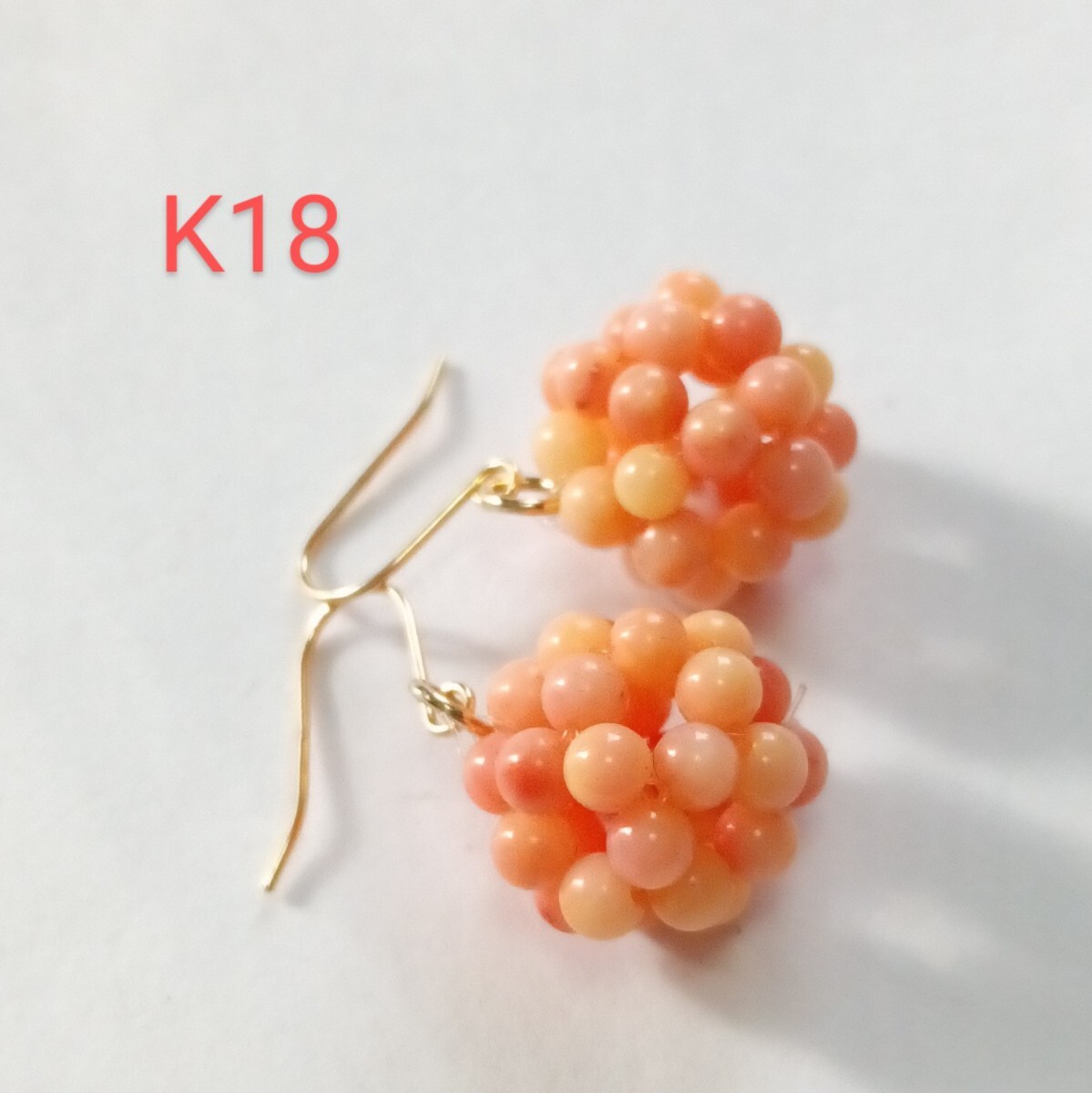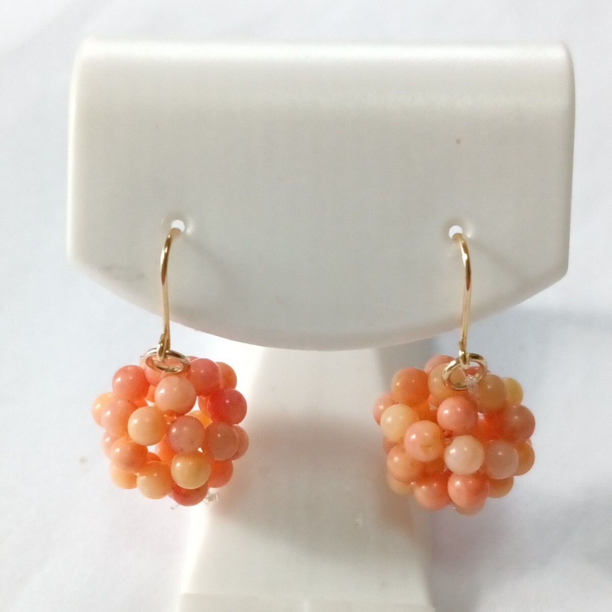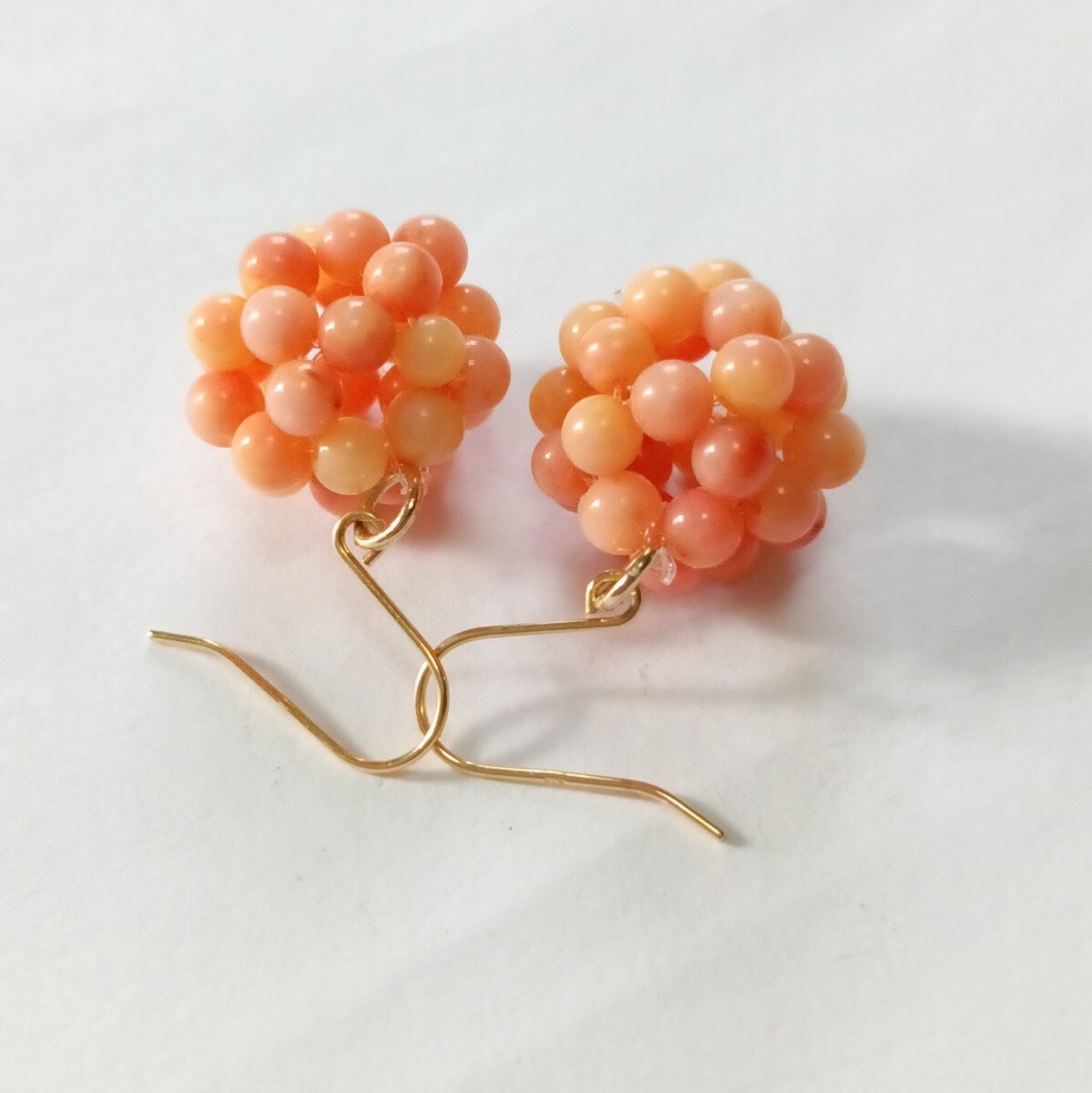 小粒のピンクサンゴをボール編みにしたフックピアスです。
