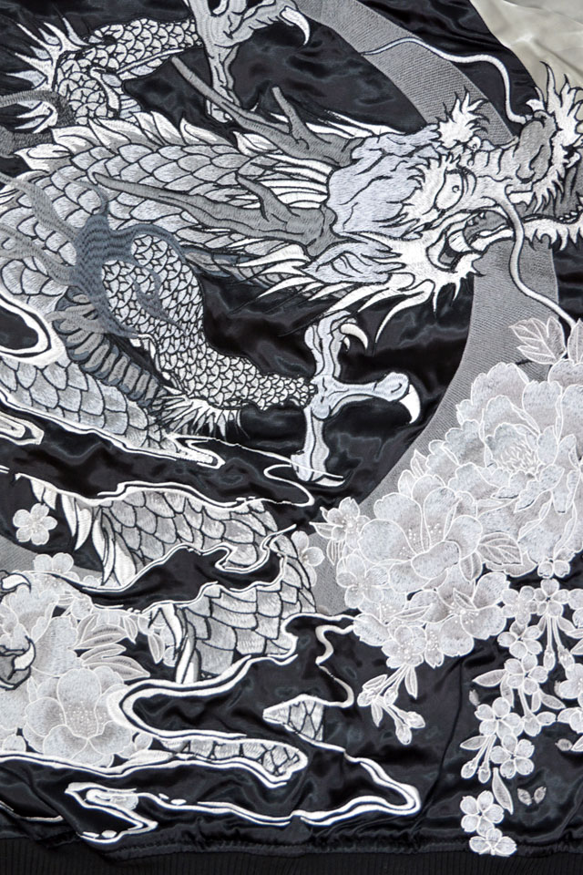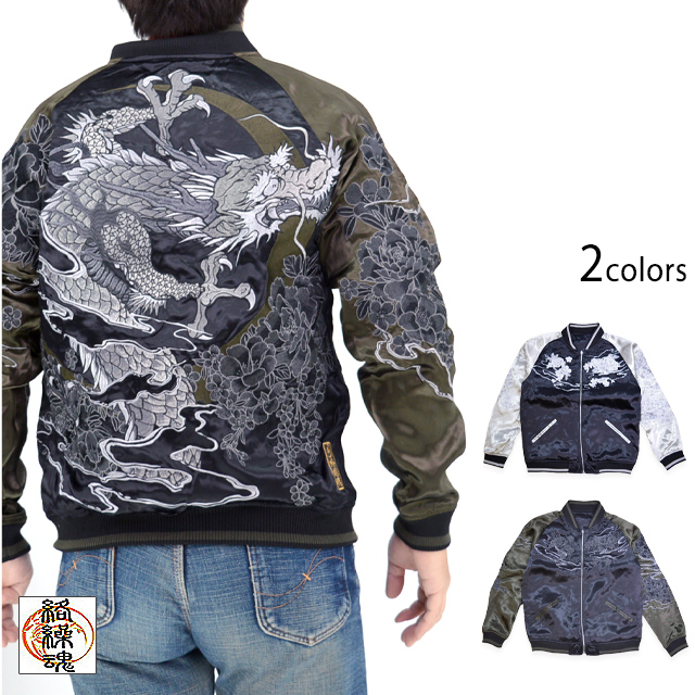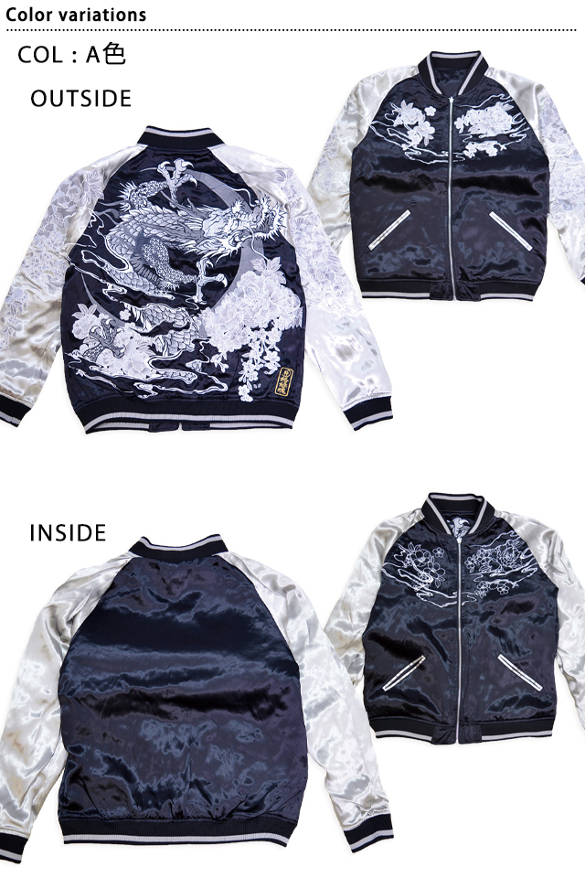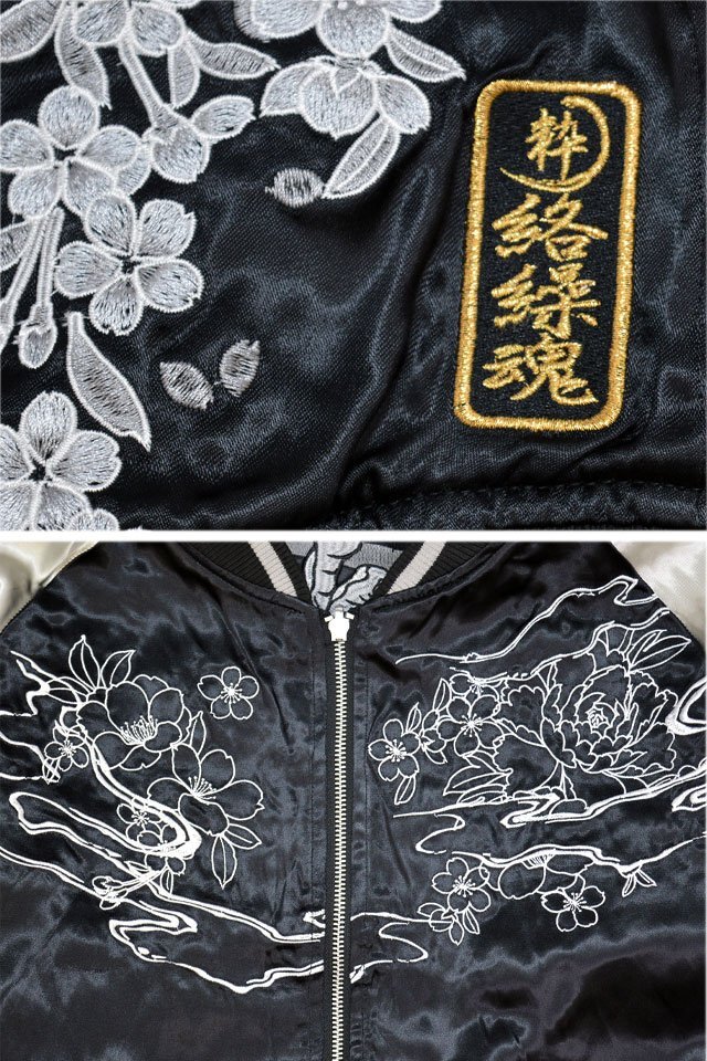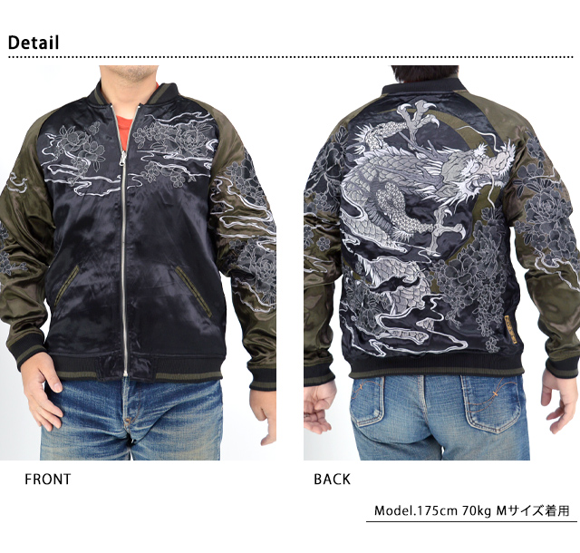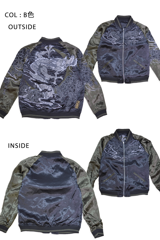 絡繰魂さんから「粋 雅龍牡丹リバーシブルスカジャン(251850)」のご紹介です。 重みを感じる程の刺繍量が魅力的な絡繰魂から、最新作のスカジャンが登場しました。 背中には、巨大な龍をダイナミックに落とし込みました。 背景には三日月と桜や牡丹を大胆にデザイン。 また、今回のスカジャンはリバーシブル仕様になっています。 ボディーにはレーヨンサテンを使用し、ドレープや陰影がくっきりと現れています。 | ||||||||||||||||||||