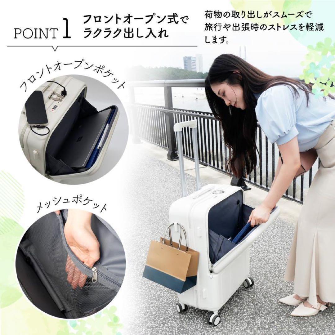 スーツケース キャリーケース キャリーバッグ Mサイズ 53L 前開き フロントオープン フロントポケット USBポート付き カップホルダー付き 2泊3日 修学旅行 4泊5日 超 軽量 軽い 4輪 かわいい おしゃれ おすすめ 出張 海外 国内 旅行 帰省 4泊 5泊 6泊 7泊 トランク 大容量 多収納 旅行や出張に最適な、USBポート付きフロントオープンカバーキャリーケース。 軽量で耐衝撃性に優れ、大容量の収納スペースを備えています。 スマートフォンやタブレットが充電可能なUSBポートやカップホルダーなど便利な機能が充実。 4輪の静音性の高いダブルキャスターが360度回転し、スムーズに移動出来ます。 ABS素材は頑丈で耐衝撃性があり、貴重品を保護してくれます。 超軽量なので長時間の持ち運びも疲れにくい♪ 〇サイズ:高さ約62cm 幅約42cm マチ幅約26cm 〇重量:約4.4kg 〇素材:プラスチック(ABS樹脂)