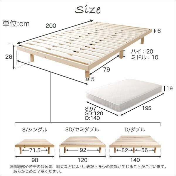 | 【商品について】 3段階高さ調節 脚付きすのこベッド(セミダブル) 【Lilitta-リリッタ-】(ポケットコイルロールマットレス付き) セミダブル■サイズ:【商品サイズ】ベッド:(約)幅 120 x 奥行 200 x 高さ 6/16/26 cmマットレス:(約)120cmx195cmx19cm(コイル数:589個)【商品重量】ベッド:20kg マットレス:(約)22kg【梱包サイズ】ベッド:(約)幅 122 x 奥行 26 x 高さ 20 cmマットレス:(約)41cmx41cmx71cm【梱包重量】ベッド:21kgマットレス:(約)23.5kg■カラー:ホワイト、ブラウン、ナチュラル(無塗装)■素材:ベッド:[本体] 天然木(パイン材) [すのこ] 合板(LVL) [表面材] ラッカー塗装(ホワイトウォッシュ、ブラウン) 無塗装(ナチュラル)マットレス:[張り材] ポリエステル100% [クッション材] ポケットコイル、ウレタンフォーム、不織布■その他:お客様組立商品です。組立目安時間 約30分 lps-hrm-sd ■メッセージにてご希望のカラーをご連絡下さい。 ※こちらよりカラーの確認をお願い致します。 こちらよりご確認ください→ |