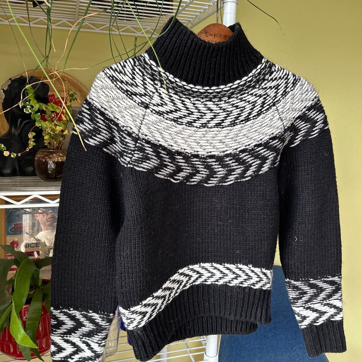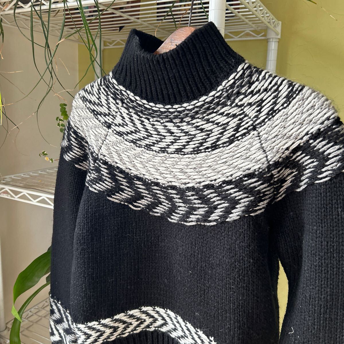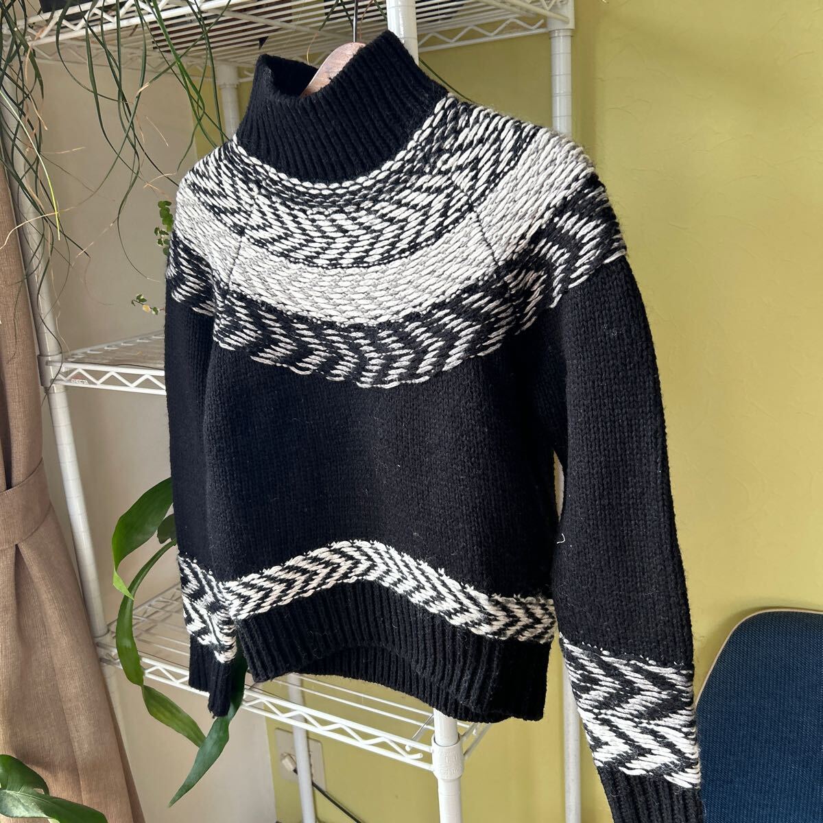 袖丈51(脇下縫目〜袖先端)多少の誤差はお許しください。良い雰囲気です。毛アクリル混紡 太めの毛糸のざっくりセーター ハイネック目 ジャガード風 できる限りダメージは説明させていただきますが、こちらが気づかない程度のわずかなしみ、よごれ、