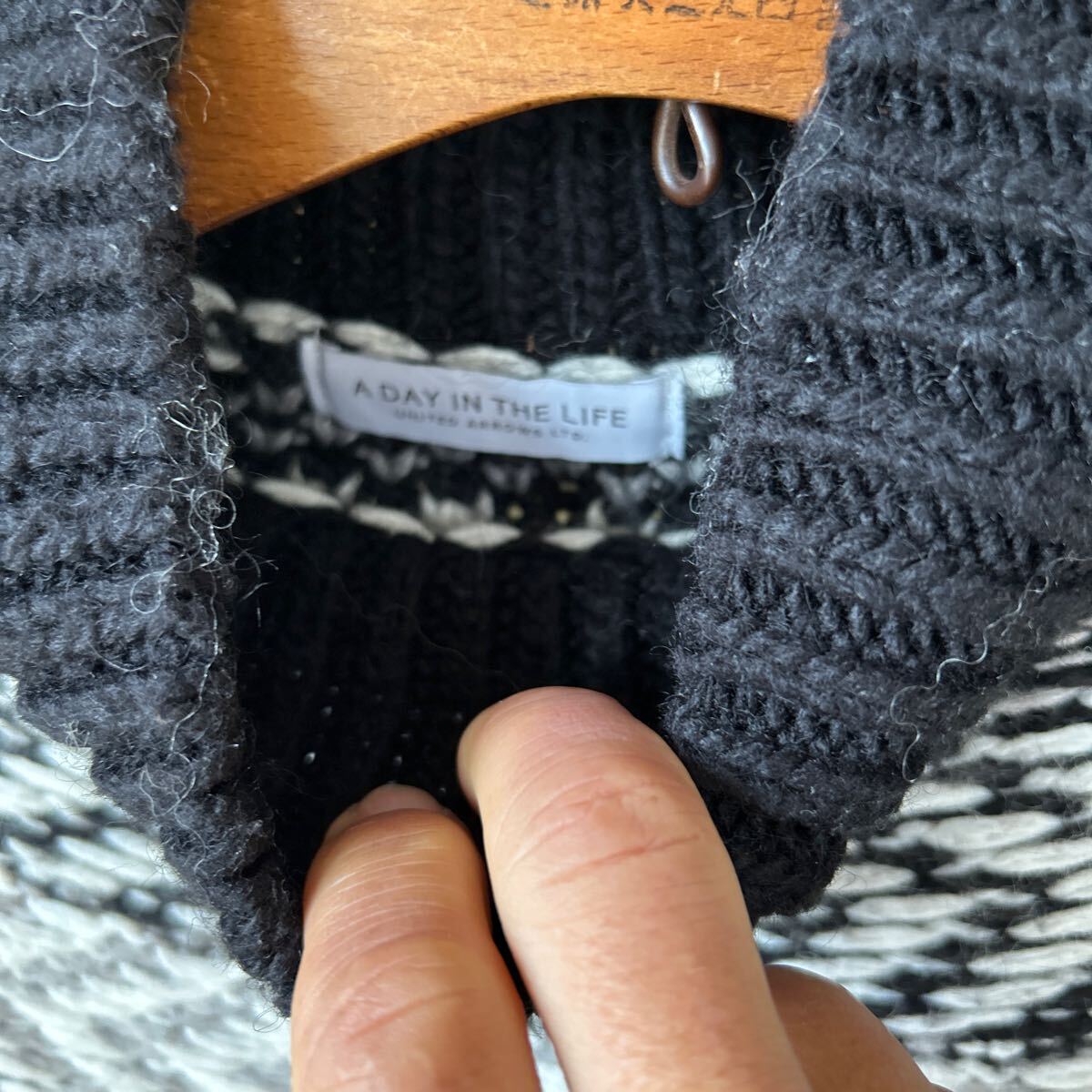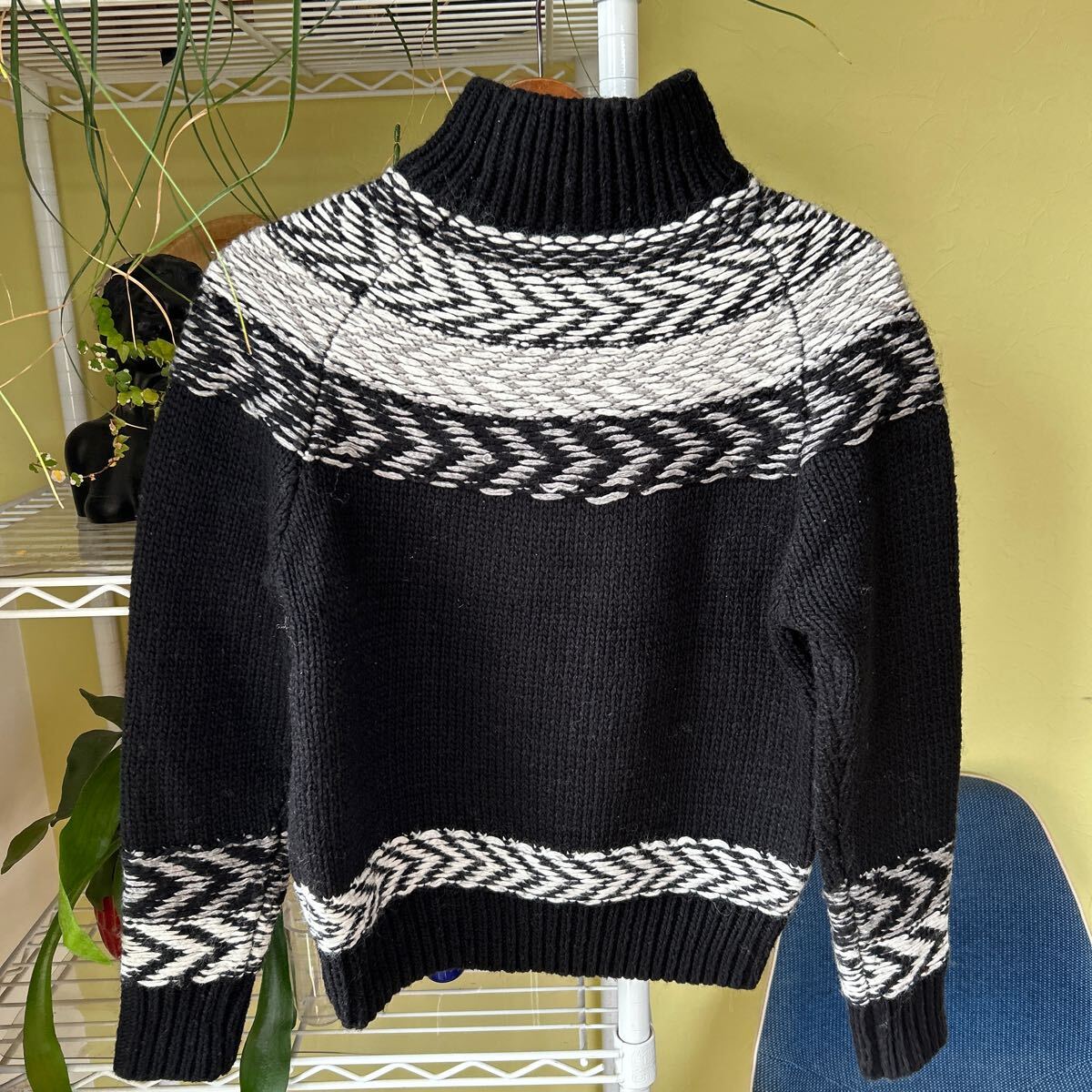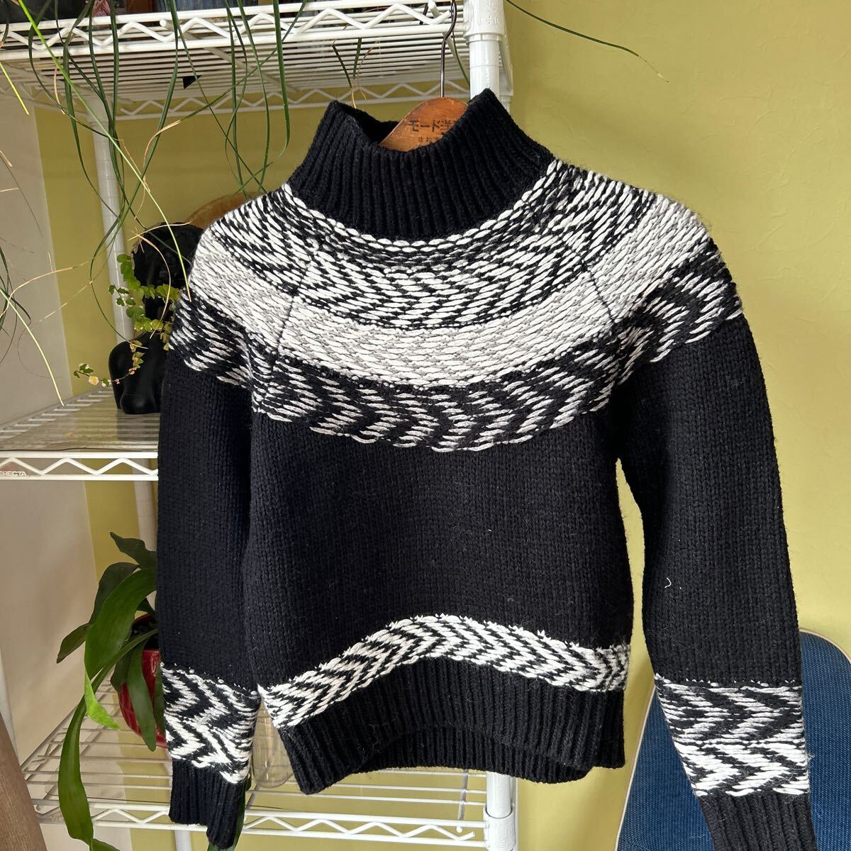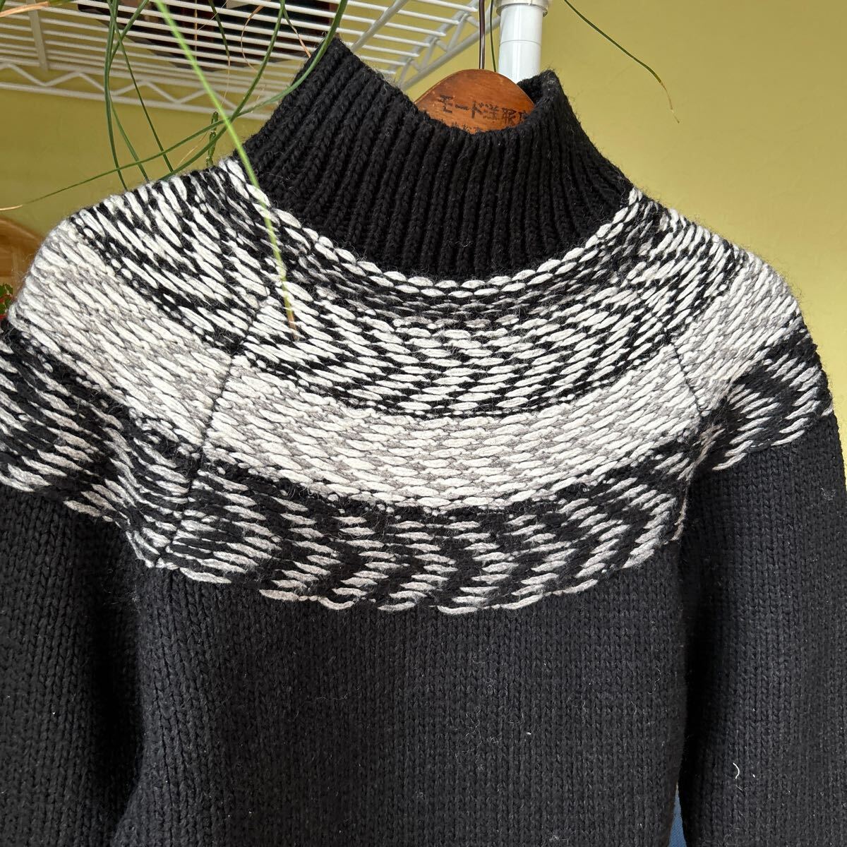 袖丈51(脇下縫目〜袖先端)多少の誤差はお許しください。良い雰囲気です。毛アクリル混紡 太めの毛糸のざっくりセーター ハイネック目 ジャガード風 できる限りダメージは説明させていただきますが、こちらが気づかない程度のわずかなしみ、よごれ、