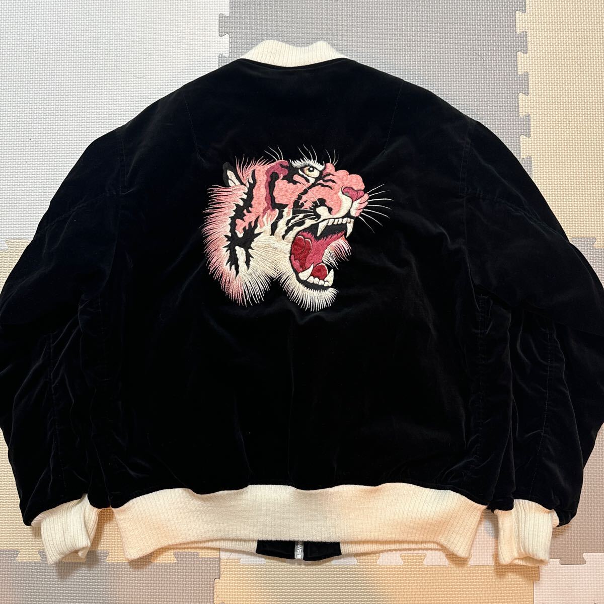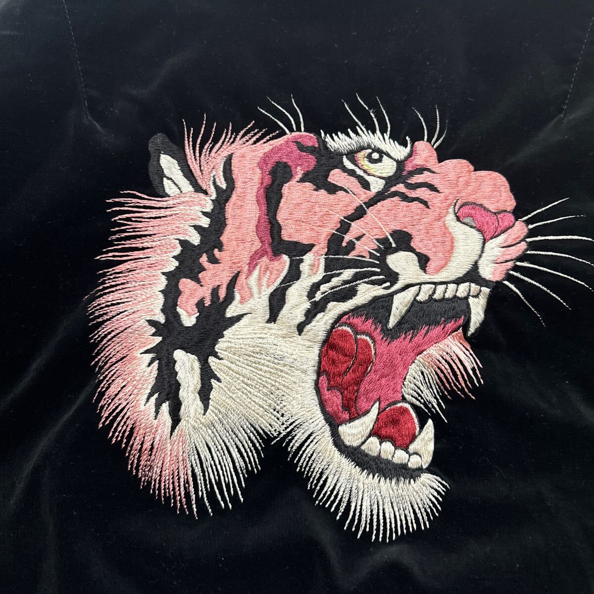 ベルベット素材(ベロア)で背面にピンクのタイガーヘッドが大きく刺繍されています。