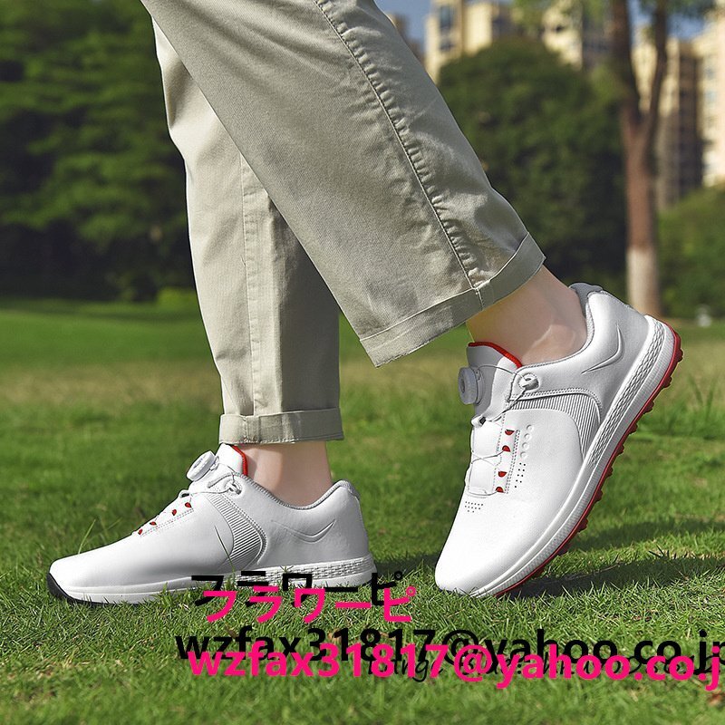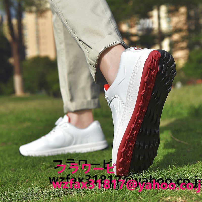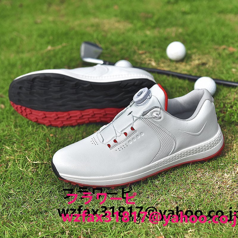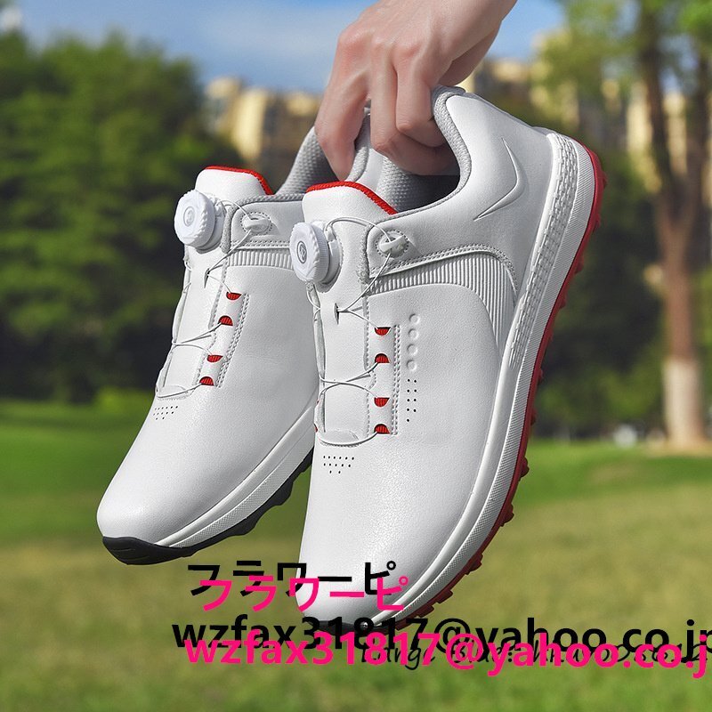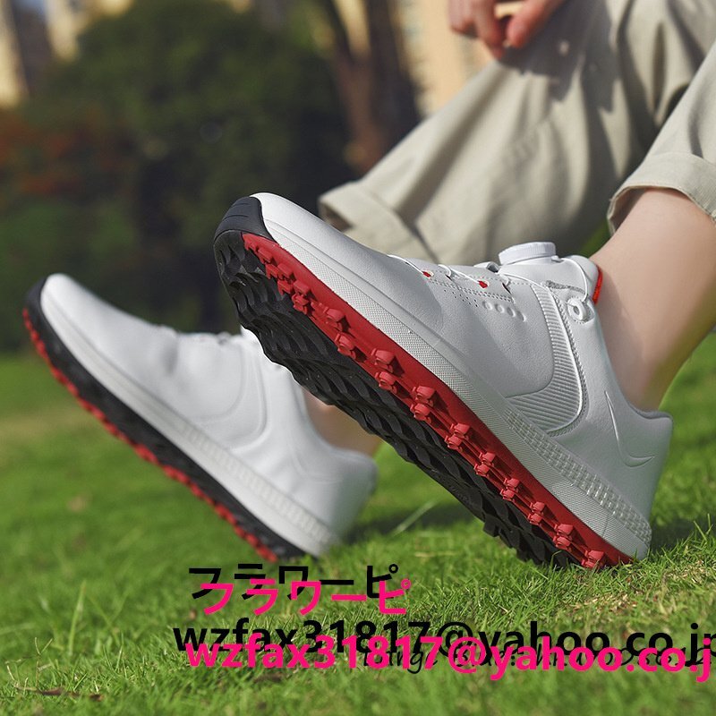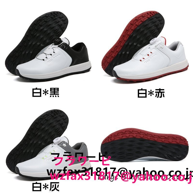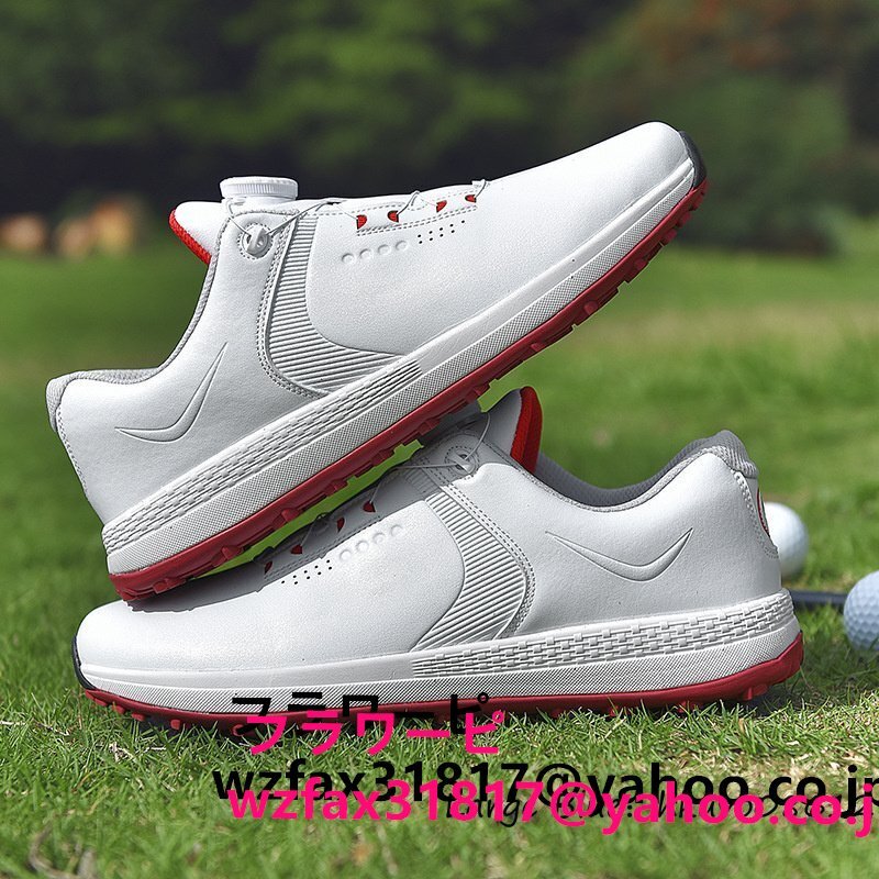 最新品★ゴルフシューズ ダイヤル式 スポーツシューズ メンズ 運動靴 幅広 フィット感 軽量 防水 防滑 耐磨 弾力性 白*赤 25.0cm