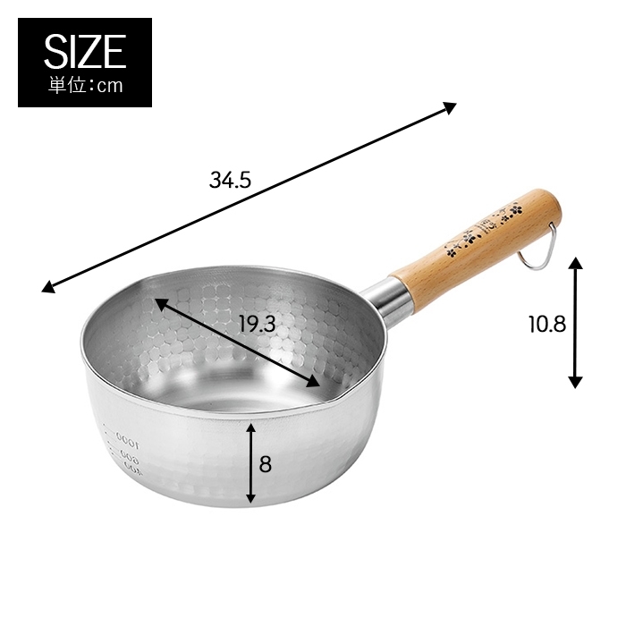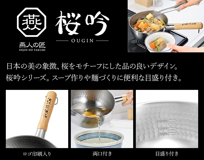 ◇日本の美の象徴、桜をモチーフにした品の良いデザイン。 ◇スープ作りや麺作りに便利な目盛り付き。(目盛表示:400ml・600ml・1000ml) ◇注ぎやすい両口付。 |