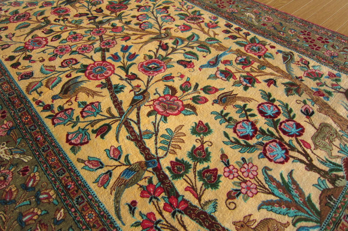 | 商品説明 | ★素材 : シルク・手織り ★サイズ : 約 155×101 cm (房を含まない長さです) ★ノット数 : 9×9/1平方センチメートル ★厚み : 0.6 cm ★産地 : イラン・クム産 ★状態 : 中古/クリーニング済み/美品 クムは日本では最も知名度の高い絨毯産地で宗教色の濃い町です。 クム絨毯の歴史は1930年頃からと浅く、最初はウール絨毯を、後にシルク絨毯を織るようになりました。絹の産地としても有名なクムで、現在作られるほとんどの絨毯は100%シルク製です。 歴史が浅い分、伝統的な柄にとらわれず、敏速に海外市場の動向や時代の潮流をとらえ、各産地の技術やデザインの要素を組合せて独自のデザインを作り出すなど、新しいペルシャ絨毯のスタイルを生み出したと言えます。 ペルシャの伝統美とヨーロッパの洗練された感覚が融合し、現代の住環境にもよく調和し、欧米でも非常に人気が高く、日本でも一番馴染みの深い産地です。 kxpgs342+ZIBACARPET絨毯 kxpgs342+ZIBACARPET取扱いペルシャ絨毯 FARSHEZIBAペルシャ絨毯_QUM |